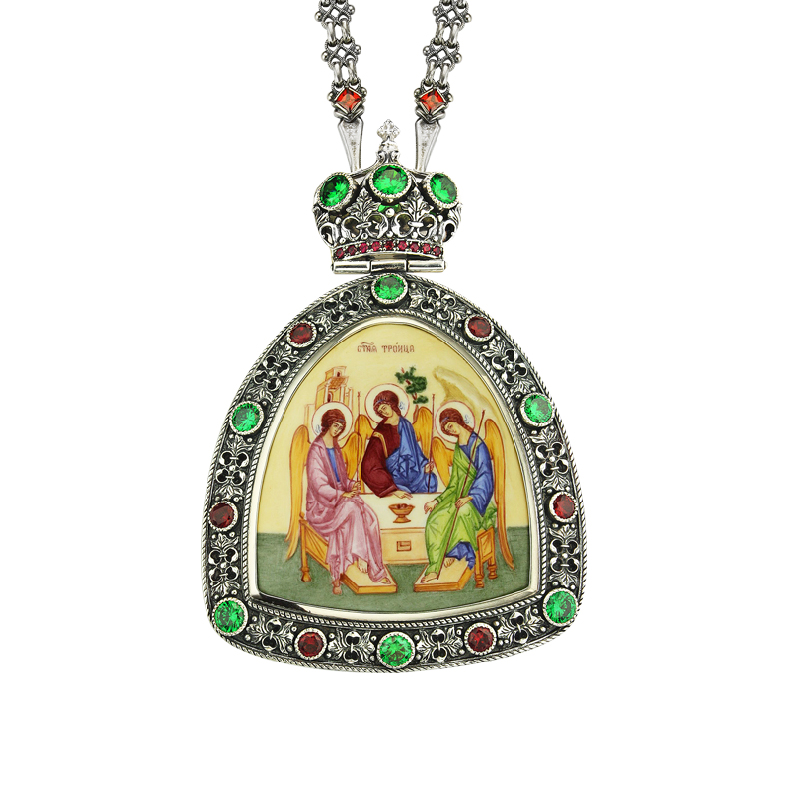 Серебряная панагия с иконой изготовлена в строгом классическом стиле VII - XIX веков с использованием современных ювелирных технологий. Центральная икона выполнена в одном из наиболее ярких видов эмалевой миниатюры - технике Ростовская финифть, которая представляет собой процесс обжига эмалевой пластины, расписанной художником огнеупорными красками. Каждый образ или изображение праздника носят эксклюзивный характер, обусловленный мастерством художника и сложностью процесса изготовления. Образ заключен в литьевую оправу с рельефным рисунком, украшенную вставками фианитов. Венчает панагию подвижное оглавие в виде короны со вставками и позолотой. Каждый камень закреплен мастером вручную, что гарантирует качественную фиксацию и долговечность при использовании.