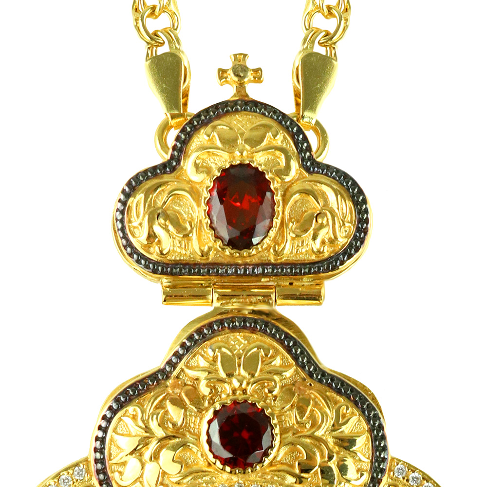Архиерейская панагия изготовлена из ювелирного сплава и покрыта золотом 999,9 пробы, нанесенным гальваническим способом. Толщина покрытия не менее 4 микрон. Образ выполнен по специальной технологии нанесения цветного изображения на латунную основу, он покрыт специальным составом, предохраняющим его от механических повреждений и воздействия света. Панагия декорирована растительным орнаментом со вставками фианитов отличного качества ручной закрепки.