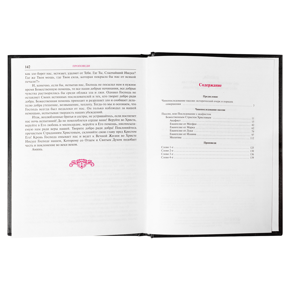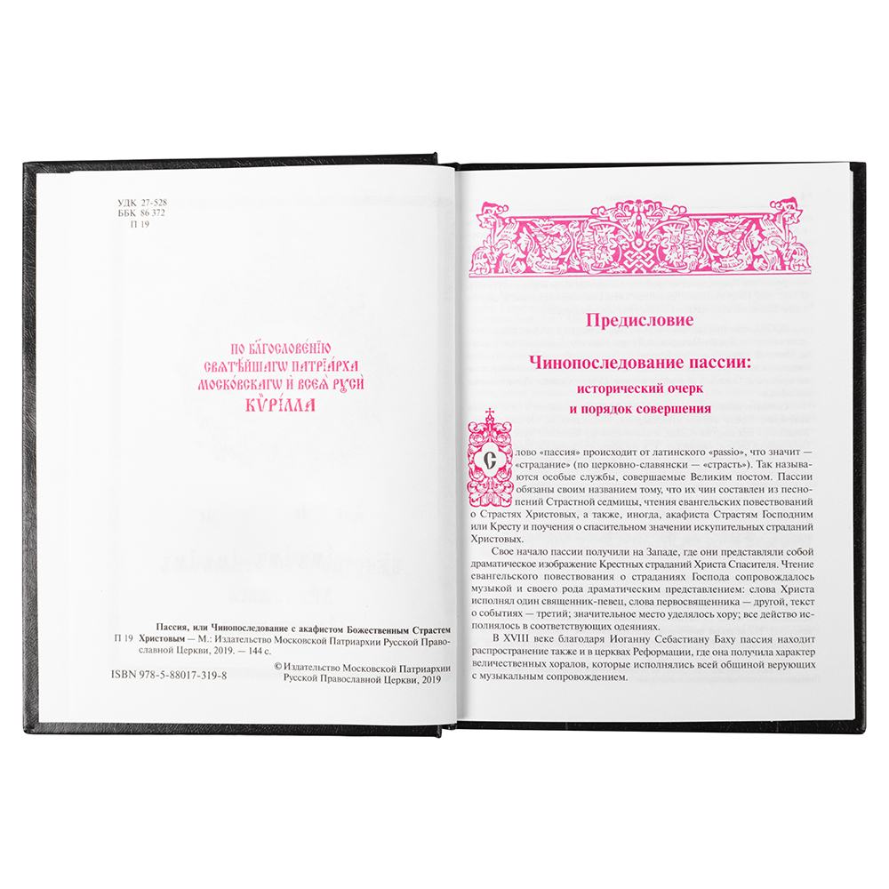 Пассия – особое богослужение, которое совершается в великопостный период. Ему посвящена одноименная книга, рекомендованная для богослужебного использования. Основное содержание издания – песнопения и чтения Страстной Седмицы, посвященные описанию событий Великой Пятницы. Кроме того, в последование включен Акафист Страстям Господним, который открывает перед верующими цену искупления человечества и призывает настроиться на достойное прохождение постных дней — усиление молитвы и ограничение в житейских радостях.