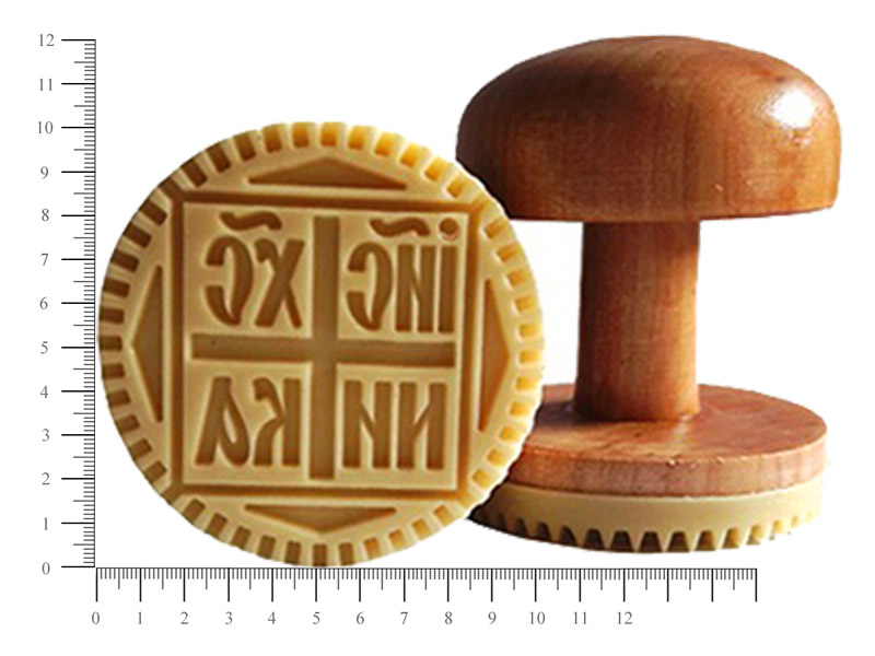 Печать для просфор составлена из двух частей - удобной деревянной ручки и печати, изготовленной из специального пищевого пластика. Она не размокает, в отличие от печатей из дерева, и дает четкий рисунок, не вступая в реакцию с хлебом. Такой материал более экологичен, чем металл, и прочнее чем дерево. Край печати для просфор окаймлён рубчатым кантиком, что придаёт законченность образу, который отпечатывается на просфоре.