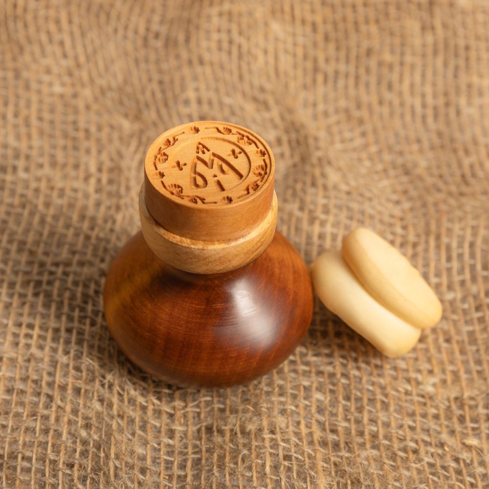 Деревянная печать для просфор поможет быстро украсить и подготовить к выпеканию партию богослужебных хлебов. Благодаря пропитке натуральными маслами материал основы сохраняет первоначальную форму и не растрескивается. Тщательная детализация объемного изображения и орнамента обеспечит четкий оттиск на плотном тесте. В продаже представлены модели разного диаметра под заготовки любого размера. Для сохранности изделия его рекомендуется чистить сразу после смены, а также исключить длительный контакт с водой и хранение в условиях повышенной влажности.