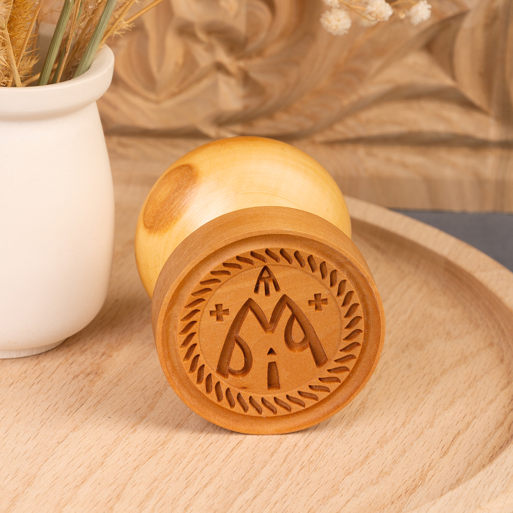 Деревянная печать для просфор "Богородичная" из древесины с детализированным резным изображением для получения четкого оттиска.