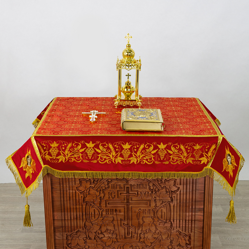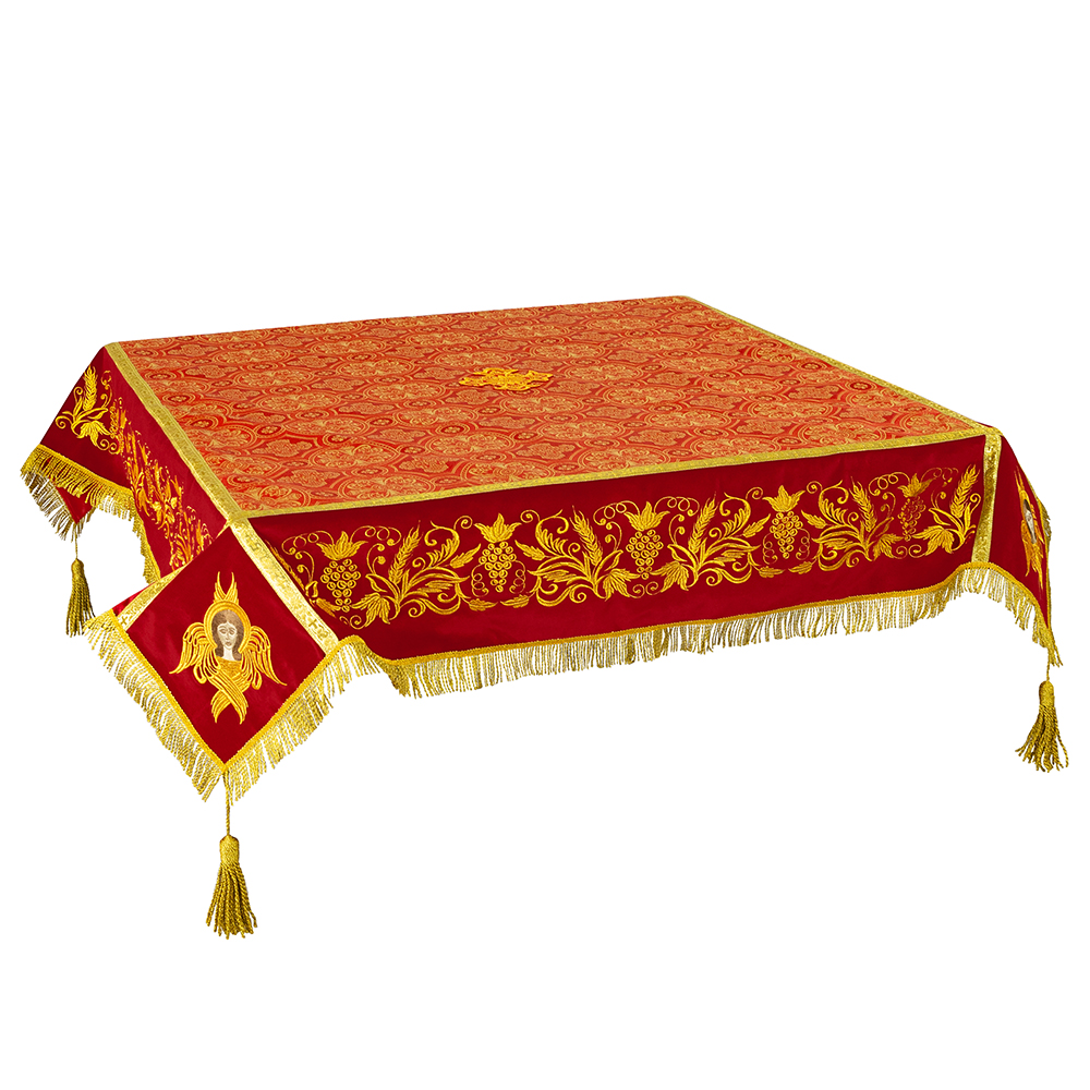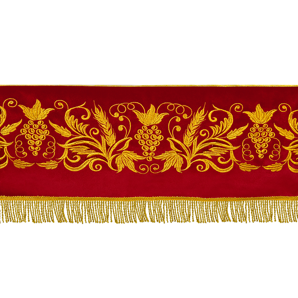 Пелена на престол из нескольких типов тканей с богатым декором в цвете "красный с золотом".