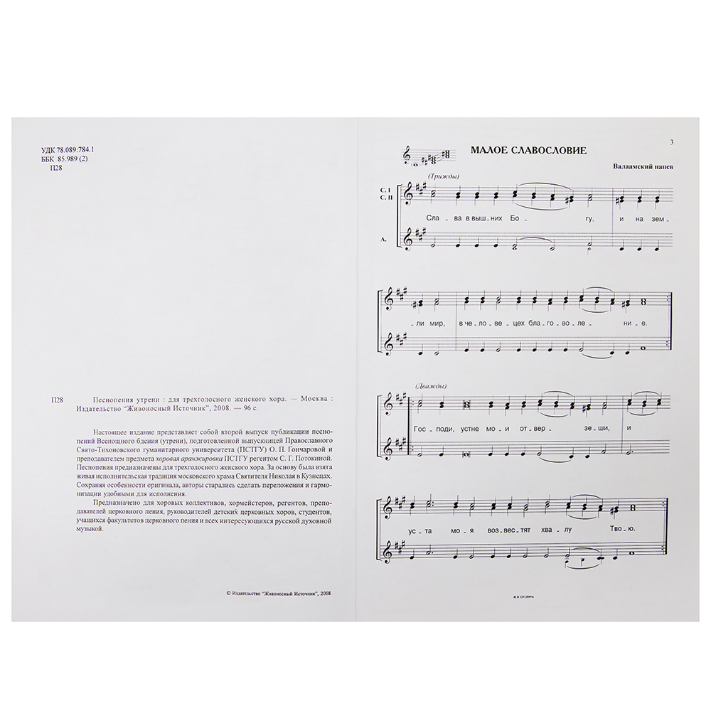 Предлагаем вашему вниманию первый выпуск переложений песнопений Всенощного бдения (утрени), подготовленный выпускницей Православного Свято-Тихоновского гуманитарного университета (ПСТГУ) О. П. Гончаровой и преподавателем предмета "Хоровая аранжировка" ПСТГУ регентом С. Г. Потокиной. Все нотные материалы адаптированы для исполнения трехголосным женским хором или трио. Основой для профессиональной обработки и аранжировки стала уникальная исполнительская традиция храма Святителя Николая в Кузнецах г. Москвы. Бережно сохраняя идею оригиналов, авторы сборника сумели сделать переложения и гармонизации максимально удобными для исполнения.