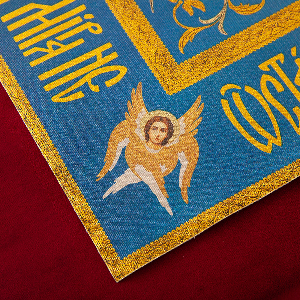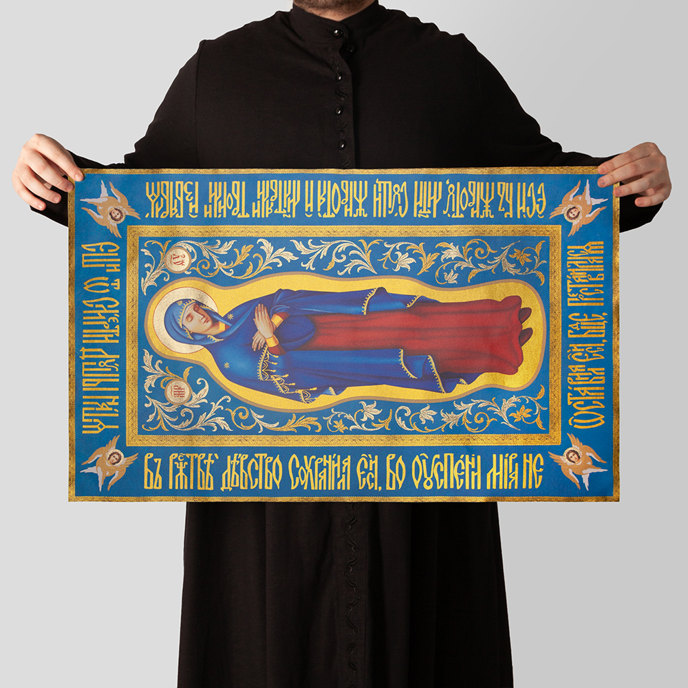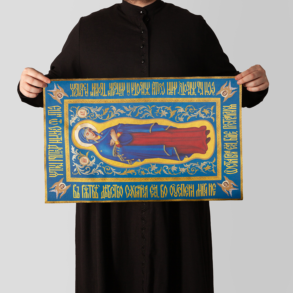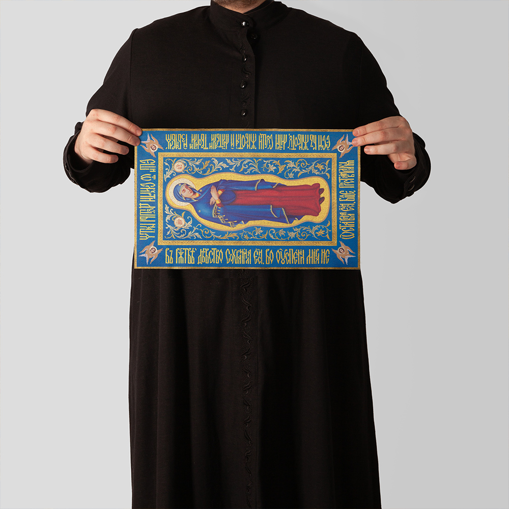 Аналойная плащаница «Успение Пресвятой Богородицы» изготовлена из натурального холста. Цветное изображение Богоматери нанесено на ткань по технологии УФ-печати. В наличии представлены плащаницы разных размеров, укажите выбранный вариант изделия при оформлении заказа.