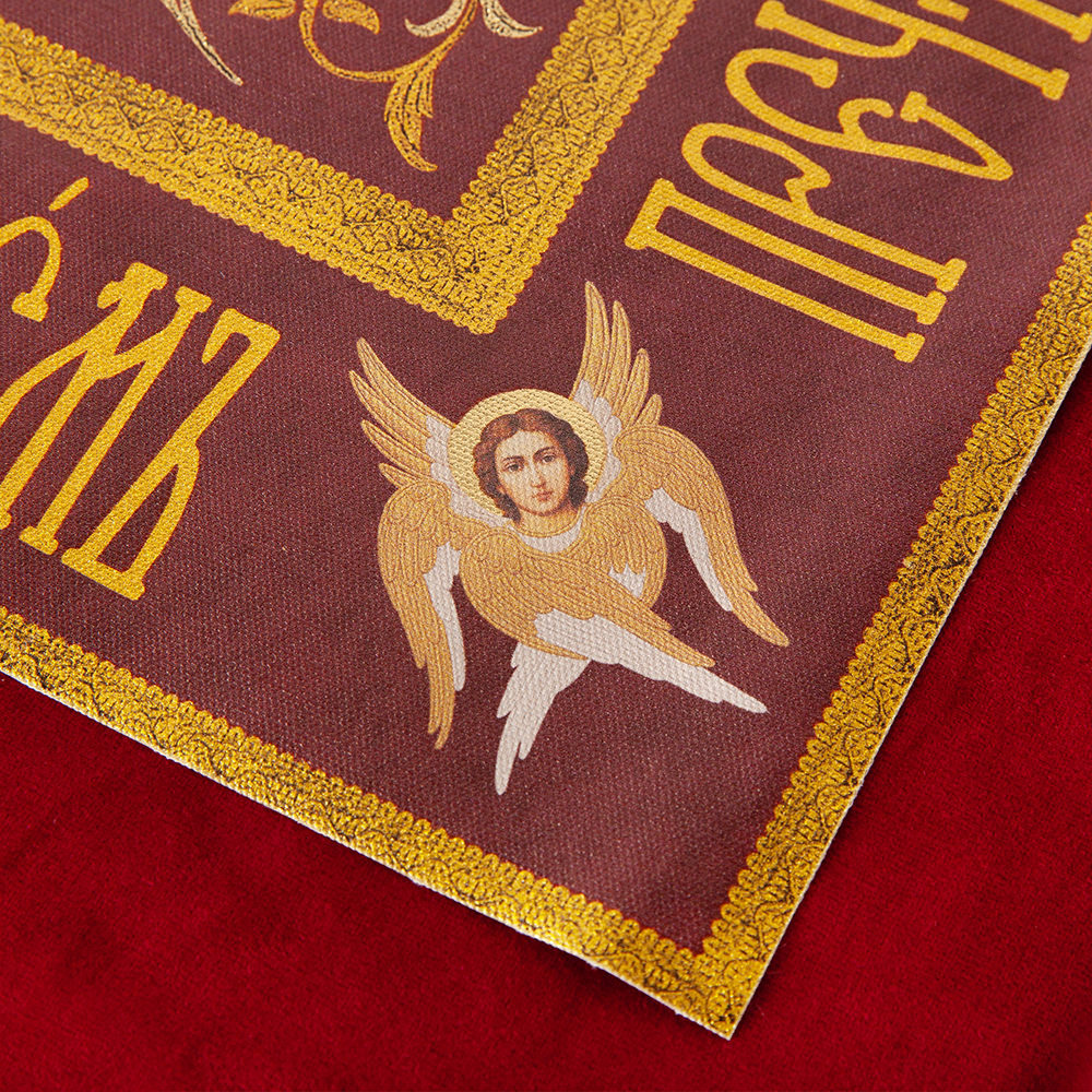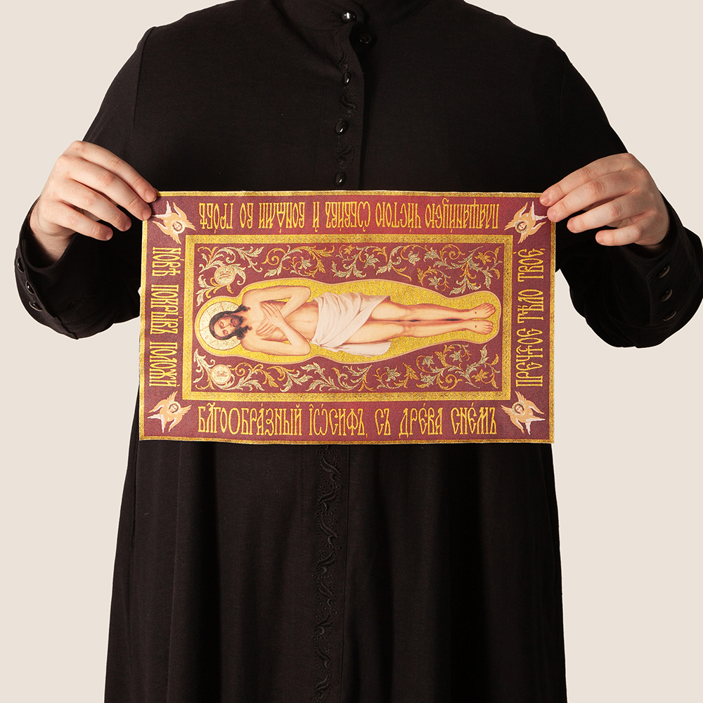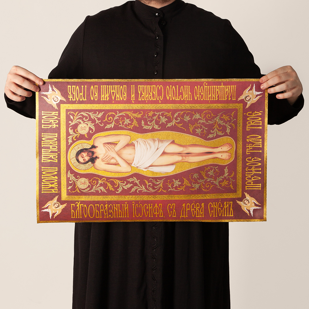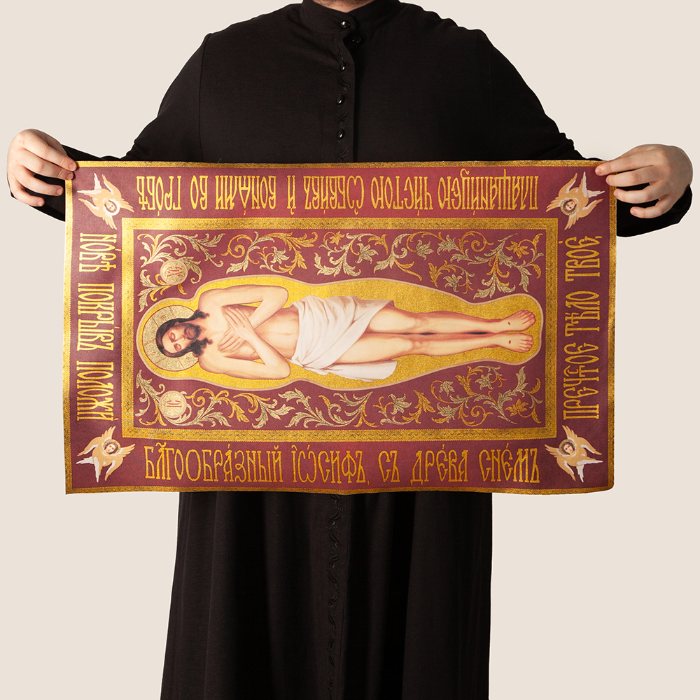 Аналойная плащаница Спасителя изготовлена из натурального холста с золочением. Цветное изображение на поверхности нанесено по технологии УФ-печати. В наличии имеются изделия разных размеров, выберите и укажите желаемый вариант при оформлении заказа.