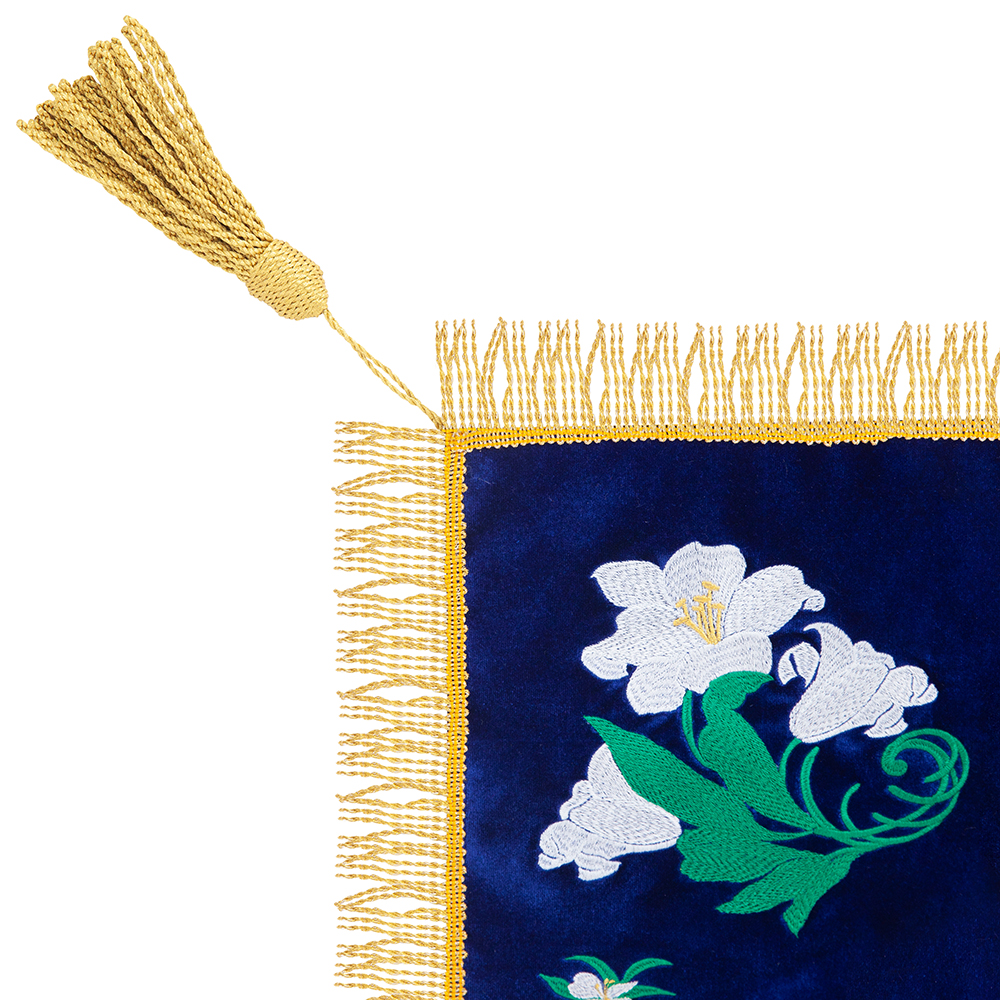 Плащаница «Успение Пресвятой Богородицы» из бархата с цветной иконой, бахромой, кистями, декоративной вышивкой на свесах и комплектацией защитной накладкой из полиэфира (опционально).