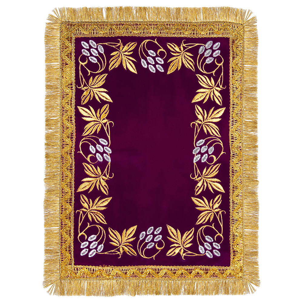 Прямоугольный плат под напрестольный крест сшит из плотной ткани. Края обшиты золотой бахромой. По периметру выполнен узор в виде виноградных гроздьев, вышитый на машине разноцветными нитками. Изделие не требует сложного ухода и надолго сохраняет привлекательный внешний вид.