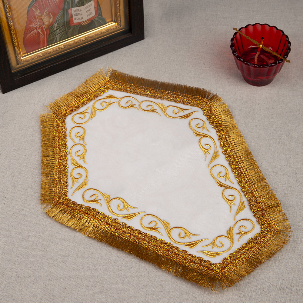 Шестигранный плат под крест сшит из качественного велюра. Срезы усилены бахромой, по контуру выполнена декоративная машинная вышивка. В наличии представлены платы с вышивкой золотыми или серебряными нитями, выберите и укажите желаемый вариант при оформлении заказа.