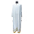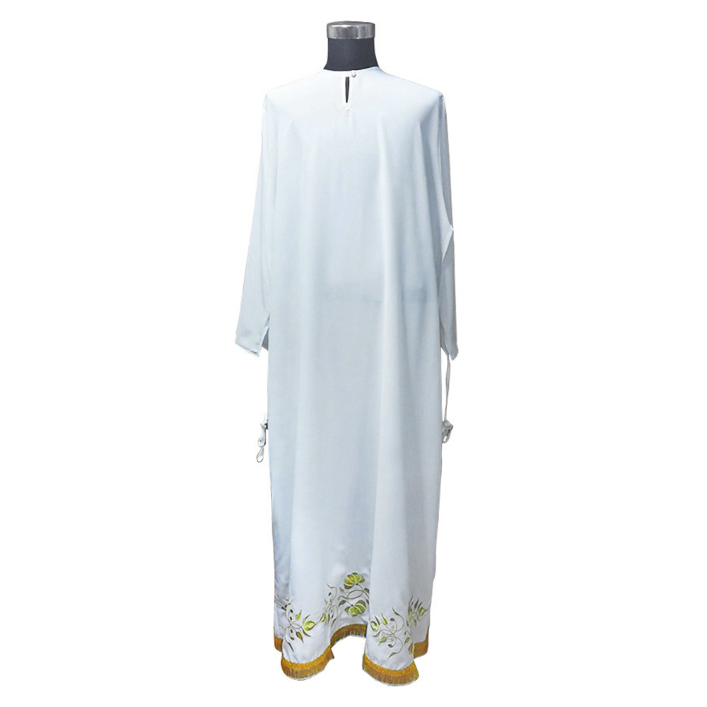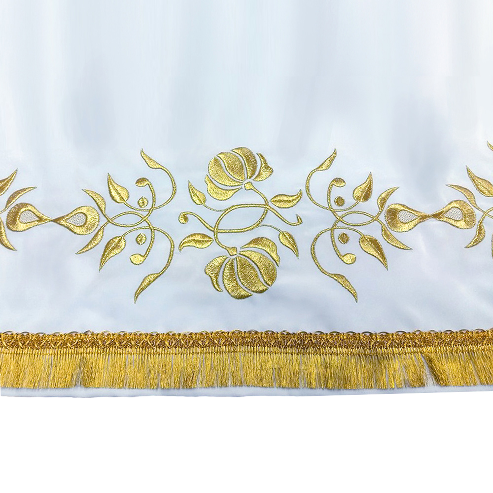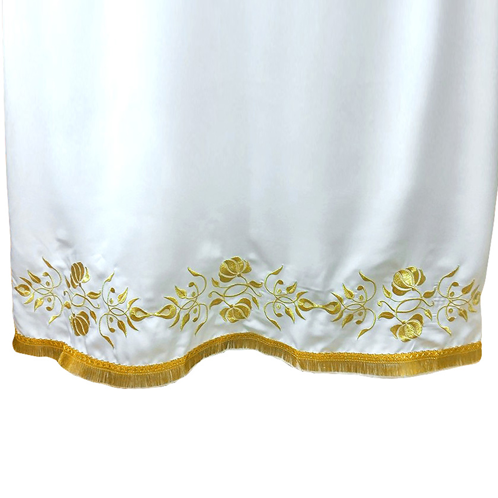 Белый подризник сшит из мокрого шелка. Низ украшен золотой бахромой. В качестве декоративной отделки использован узор в виде растительного орнамента, выполненный по технологии машинной вышивки. Таким же способом вышит крест в верхней части спинки. Линия ворота усилена дополнительным слоем ткани, предусмотрена аккуратная застежка на пуговицу.