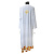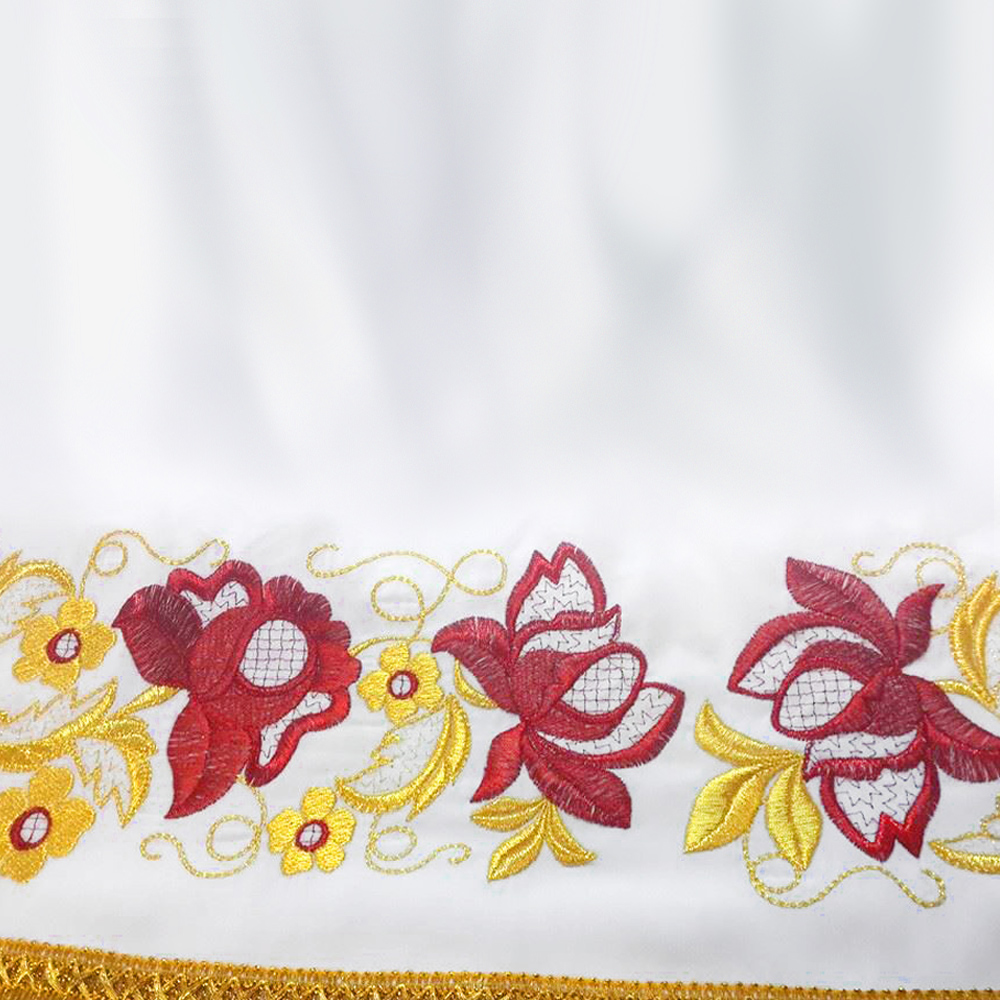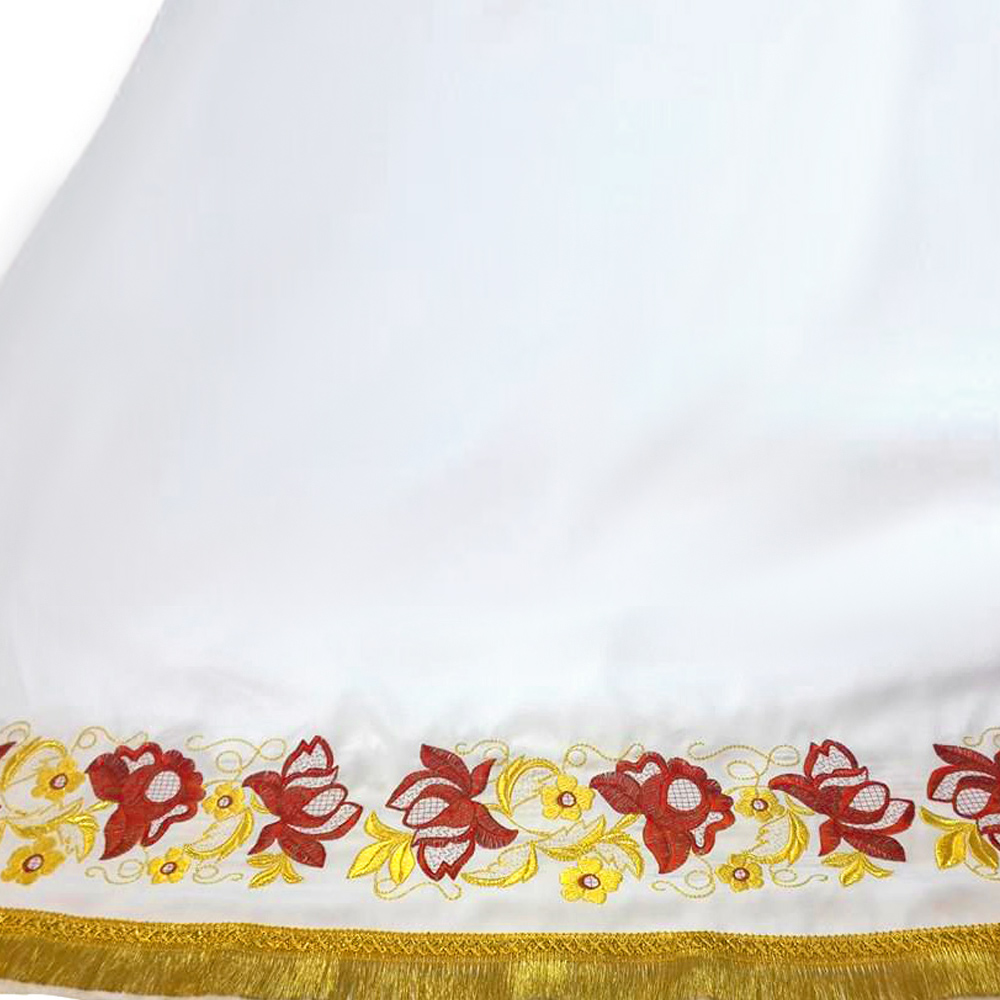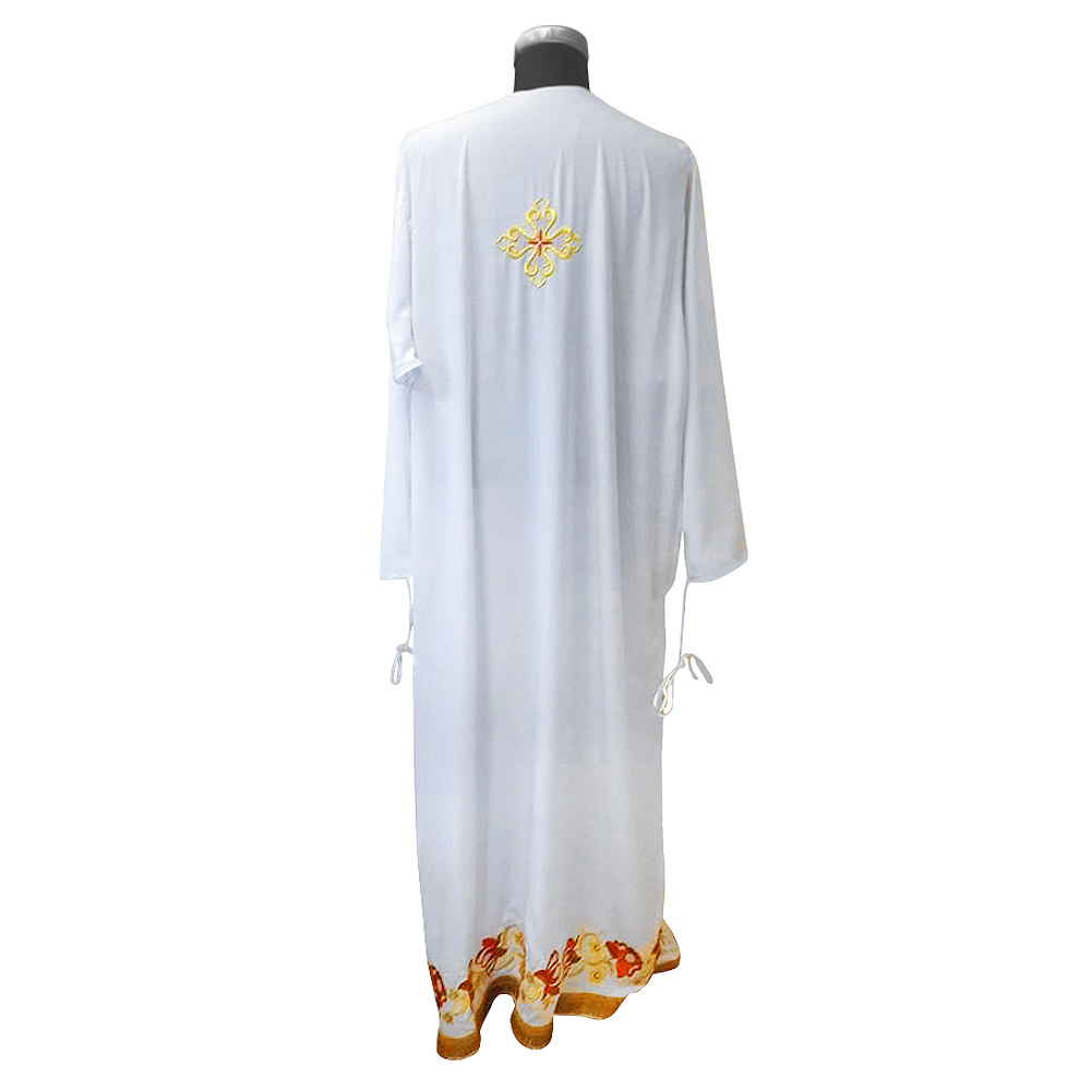 Белый подризник сшит из мокрого шелка. Низ украшен золотой бахромой. В качестве декоративной отделки использован узор в виде цветочного орнамента, выполненный по технологии машинной вышивки. Таким же способом вышит крест в верхней части спинки. Линия ворота усилена дополнительным слоем ткани, предусмотрена аккуратная застежка на пуговицу.