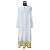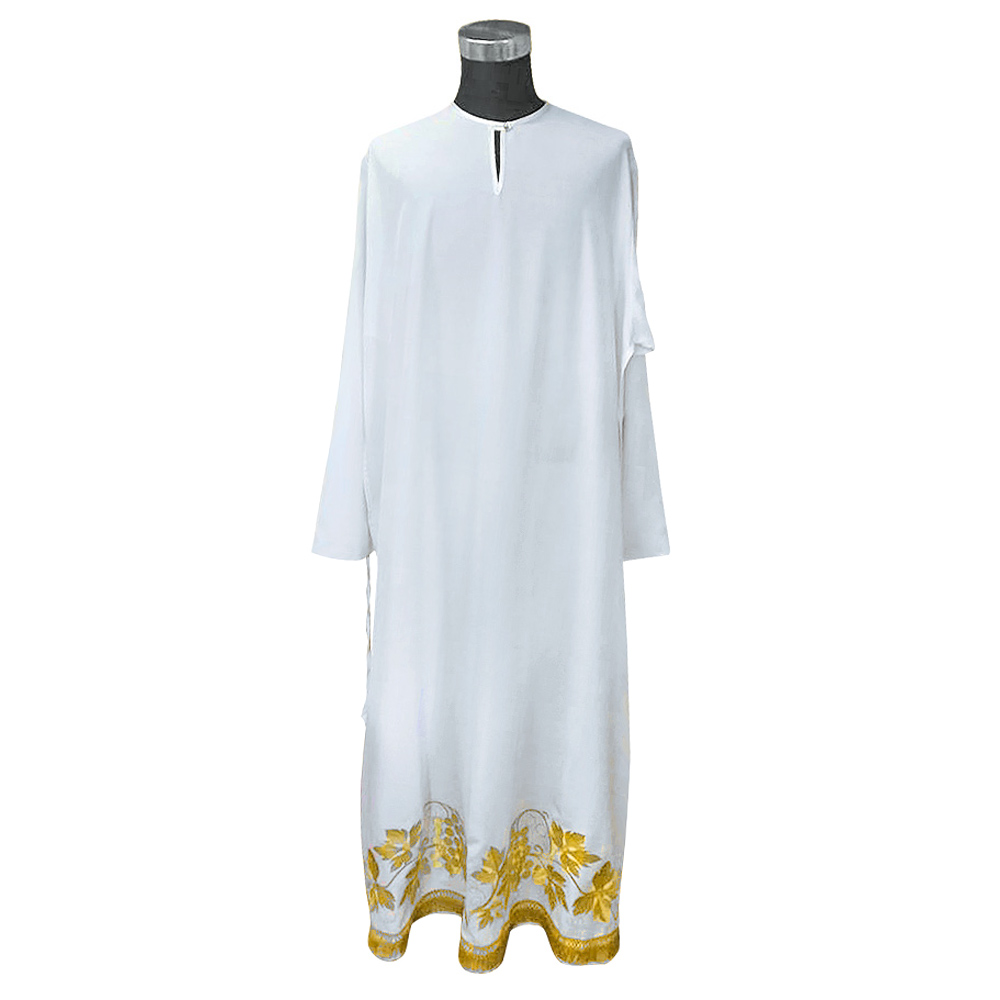 Белый подризник сшит из мокрого шелка. Низ украшен золотой бахромой. В качестве декоративной отделки использован узор "Виноградная лоза", выполненный по технологии машинной вышивки. Таким же способом вышит крест в верхней части спинки. Линия ворота усилена дополнительным слоем ткани, предусмотрена аккуратная застежка на пуговицу.