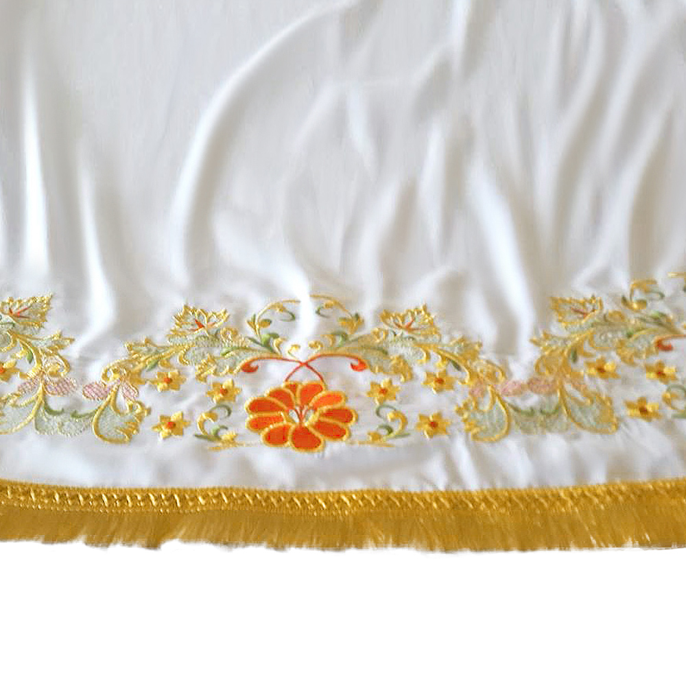 Белый подризник сшит из мокрого шелка. Низ украшен золотой бахромой. В качестве декоративной отделки использован узор в виде цветочного орнамента, выполненный по технологии машинной вышивки. Таким же способом вышит крест в верхней части спинки. Линия ворота усилена дополнительным слоем ткани, предусмотрена аккуратная застежка на пуговицу.