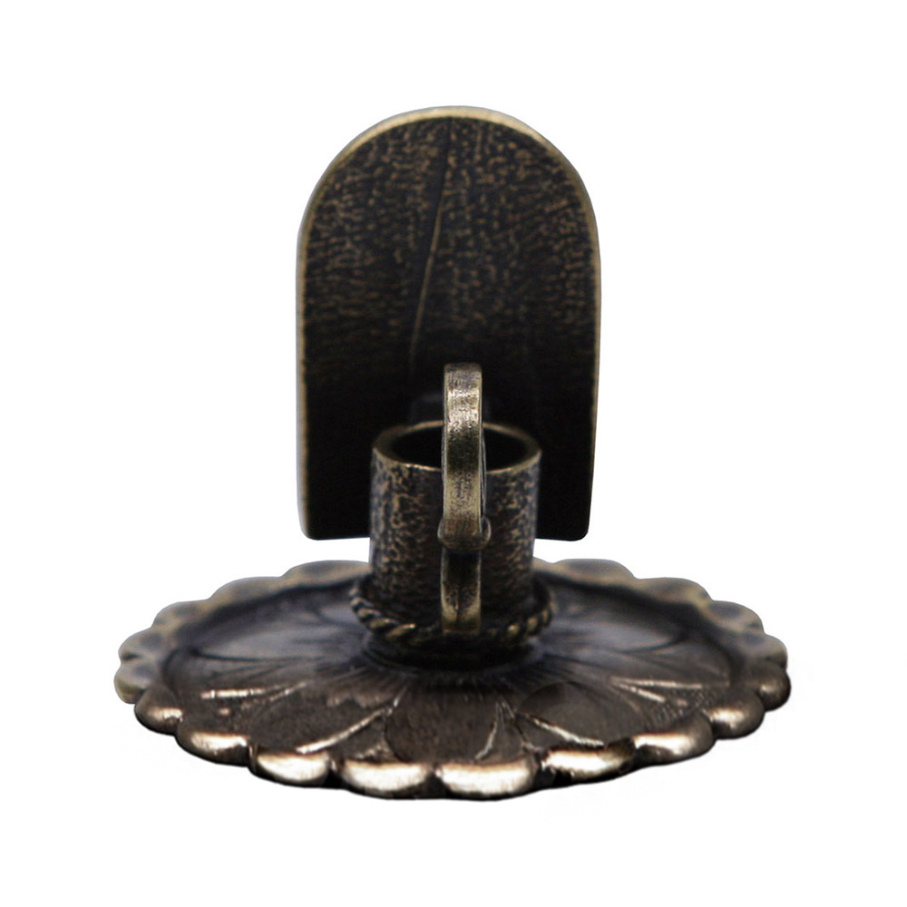 Подсвечник отлит из бронзы, которая обладает более благородным цветом, чем латунь. Он выглядит достойно и ему не грозит порча внешнего вида, как у других изделий, покрытых зачастую тонким слоем золота или серебра, который довольно быстро стирается. На круглое основание подсвечника удобно положить огарок спички или свечи. Подсвечник устойчиво стоит как на ладони, так и на любой ровной поверхности.