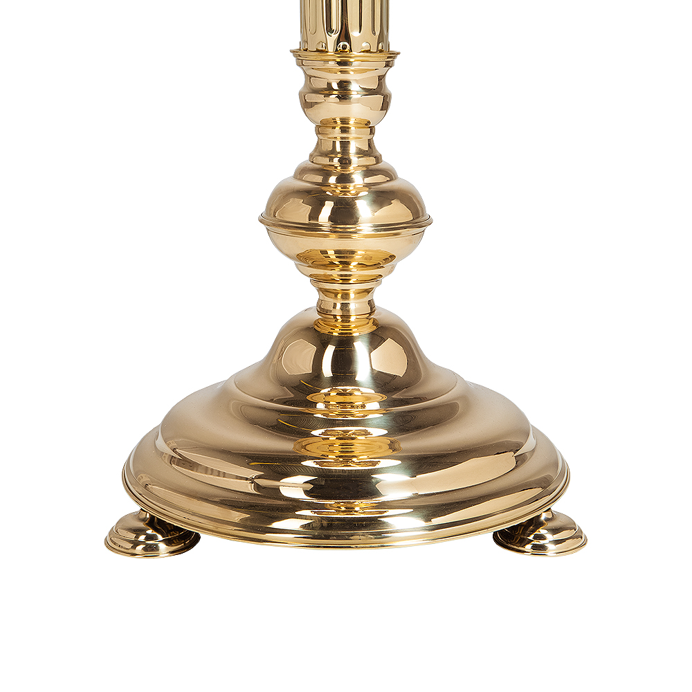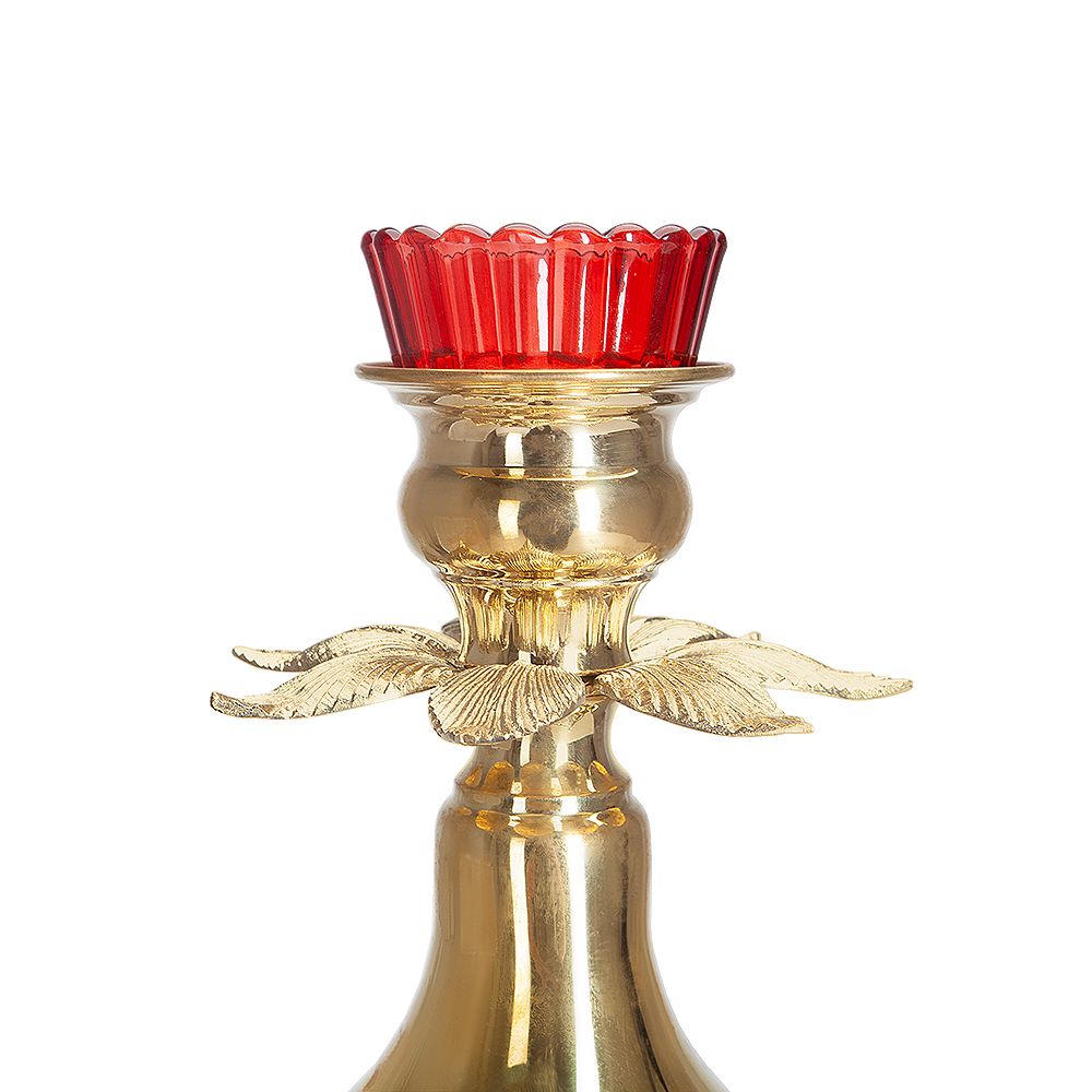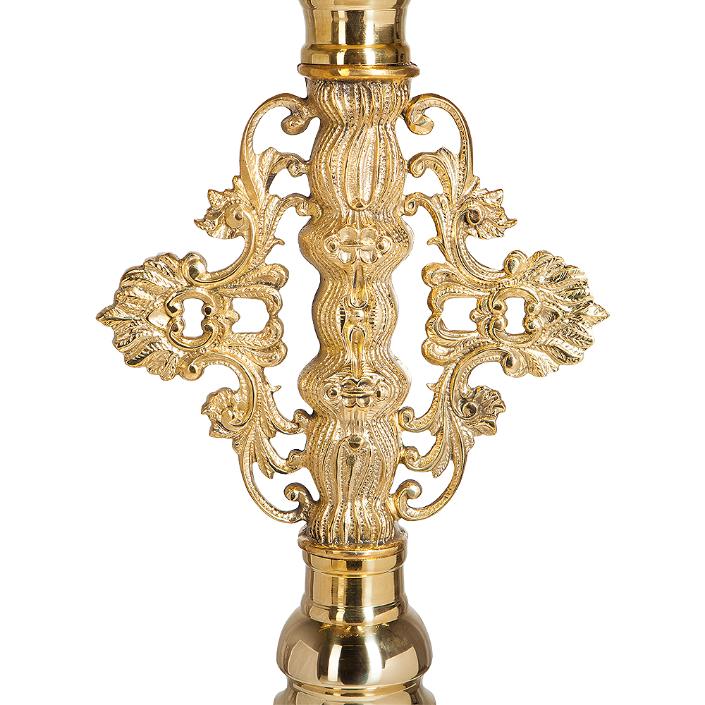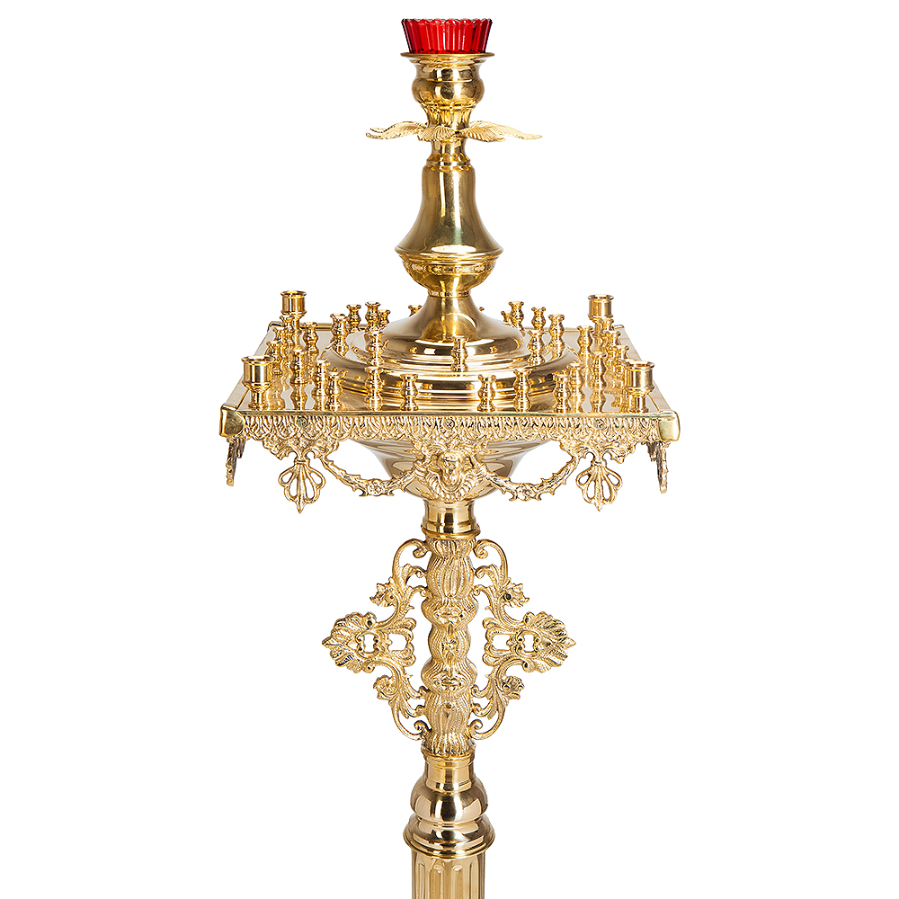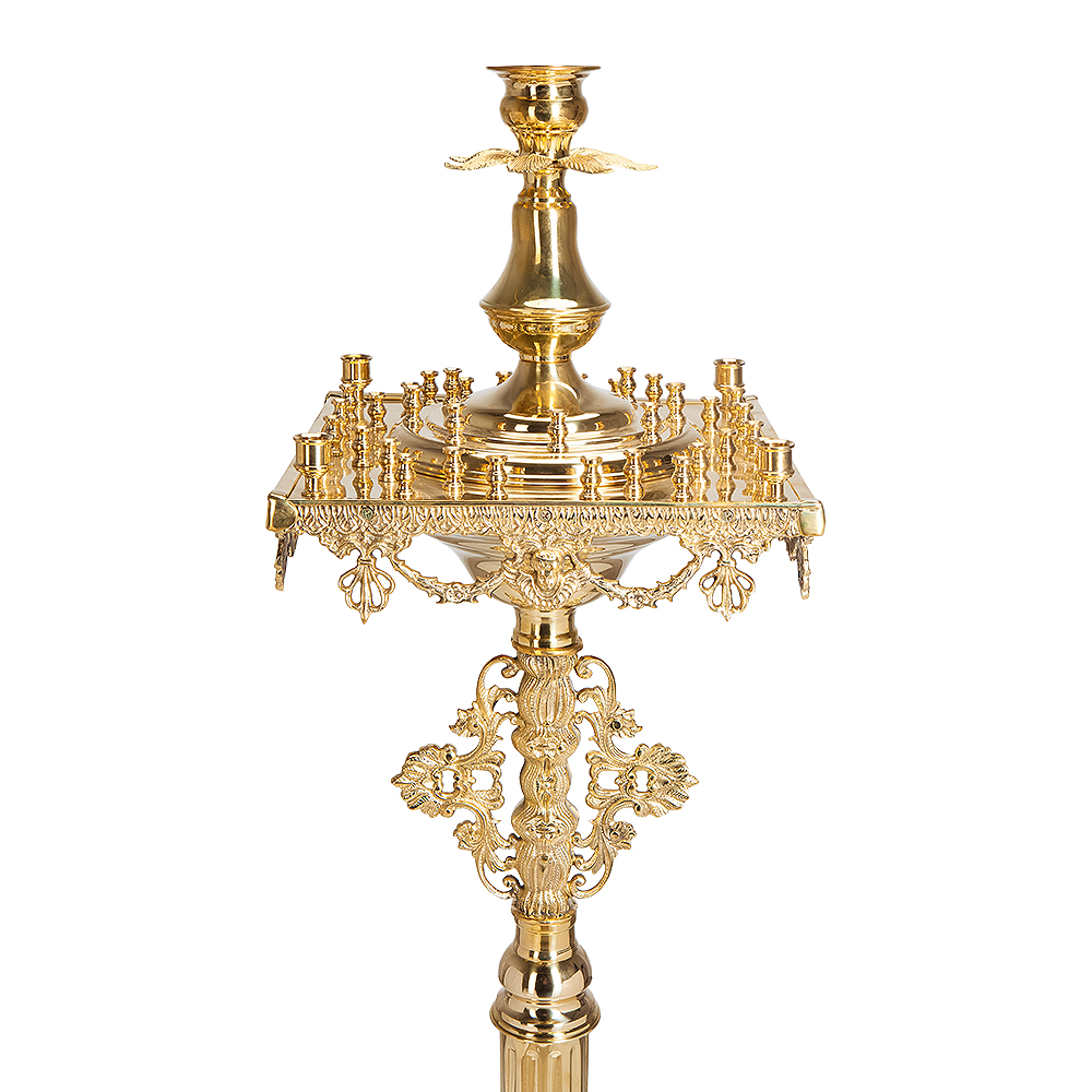 Напольный подсвечник на 40 свечей изготовлен из латуни. Высокую конструкцию удерживает круглое основание. В верхней части размещена подставка с чашами под свечи разного диаметра. В ее центре на небольшой опоре установлена чаша под лампаду, украшенная по периметру рельефными листьями. Для декорирования подставки использованы металлические подвески в виде кружевных фестонов. Опора под свечами украшена симметричными вставками в виде переплетающихся ветвей. Дополнительный объем нижней части придают рельефные грани по всей длине фрагмента. Конструкция отличается повышенной устойчивостью и легко переносится в другое место во время уборки. Изделие украсит центральную часть храма или пространство возле иконы в настенном или напольном киоте.