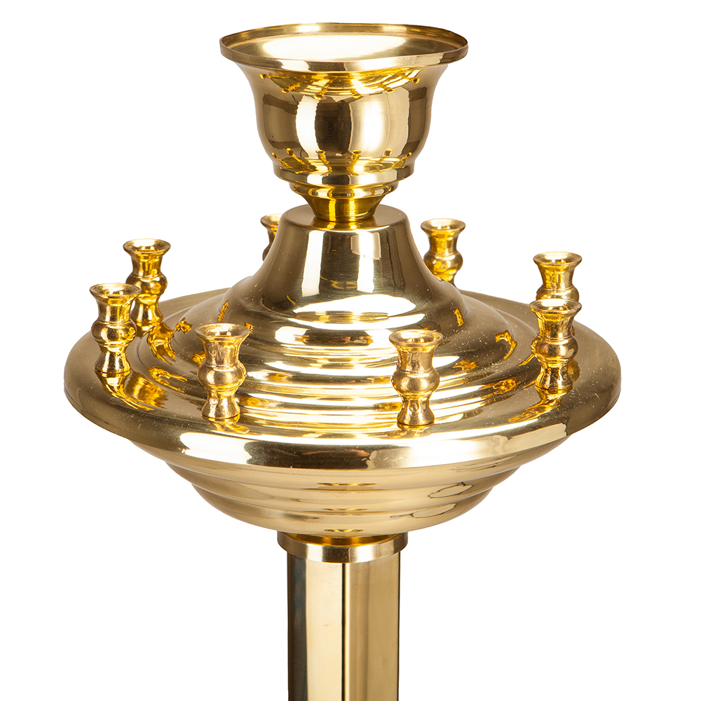 Напольный подсвечник на 8 свечей изготовлен из высококачественного латунного сплава. Высокая конструкция надежно опирается на широкое круглое основание со скрытыми ножками. Гладкая поверхность легко очищается от загрязнений. Диаметр отверстия для свечи – 0,9 см.