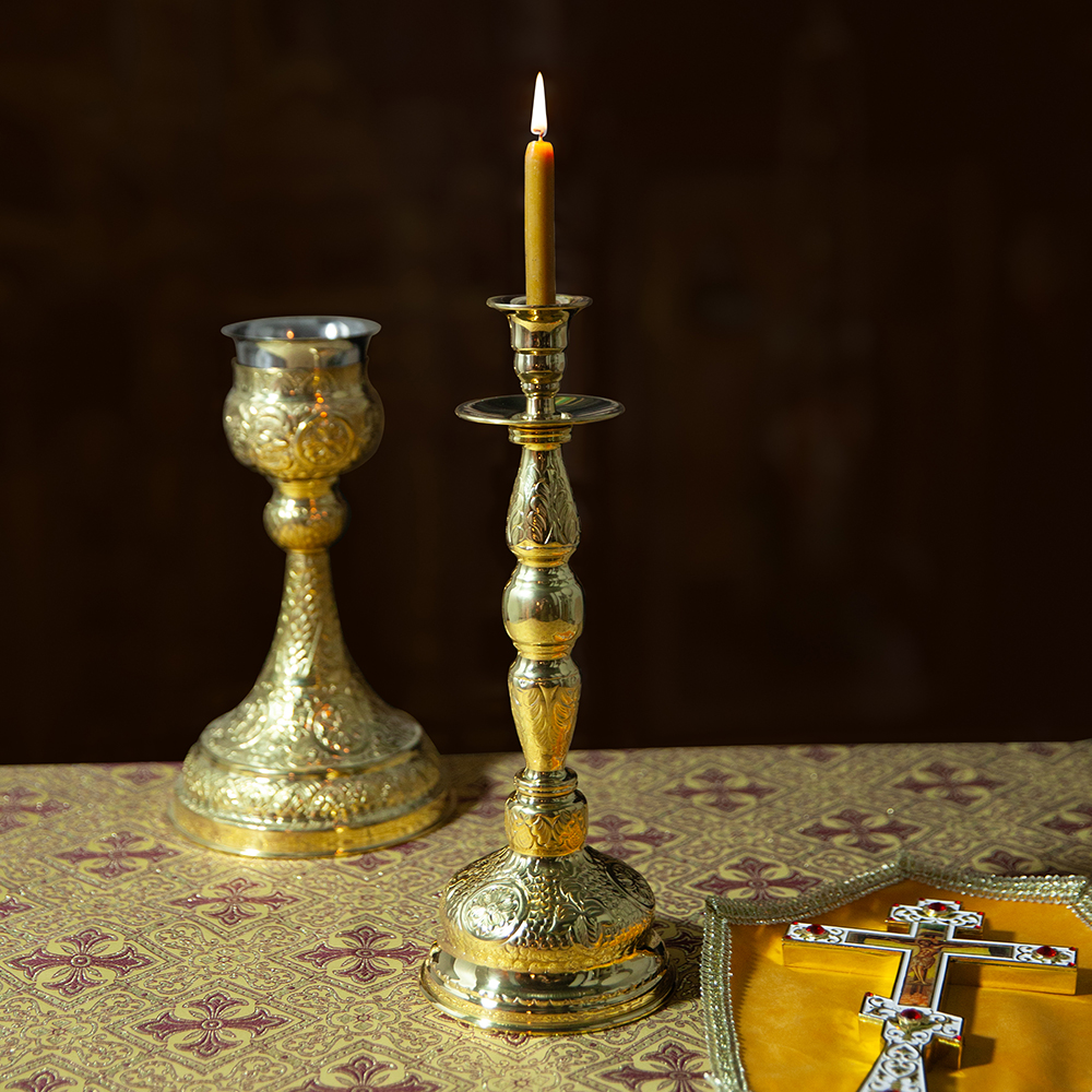 Напрестольный подсвечник изготовлен из латунного сплава. Высокая модель с рельефной поверхностью надежно опирается на широкое круглое основание. Лаконичный внешний вид деликатно оттеняет чеканный орнамент. Напрестольный подсвечник украсит алтарную часть старинного или современного храма, выгодно выделяясь на фоне другой церковной утвари.