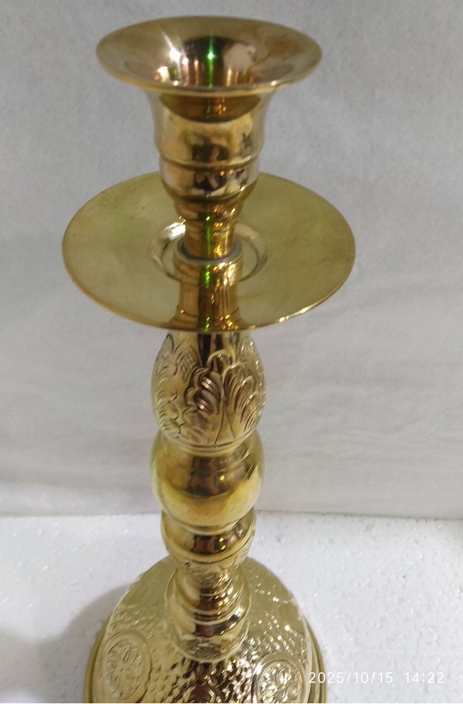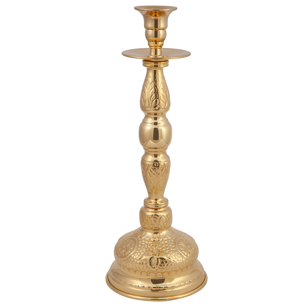 Напрестольный подсвечник изготовлен из латунного сплава. Высокая модель с рельефной поверхностью надежно опирается на широкое круглое основание. Лаконичный внешний вид деликатно оттеняет чеканный орнамент. Напрестольный подсвечник украсит алтарную часть старинного или современного храма, выгодно выделяясь на фоне другой церковной утвари.