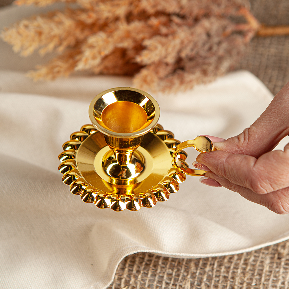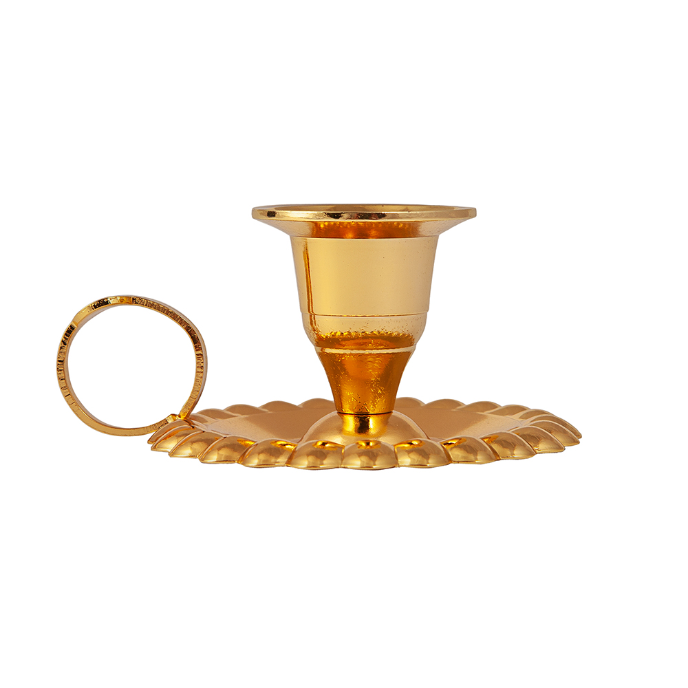 Подсвечник изготовлен из цинкового сплава. Модель оригинальной формы опирается на широкое основание-блюдце с фестонным краем. Удобная ручка позволит перемещать подсвечник вместе с горящей свечой. Изделие станет хорошим подарком к празднику и украсит красный угол в доме.