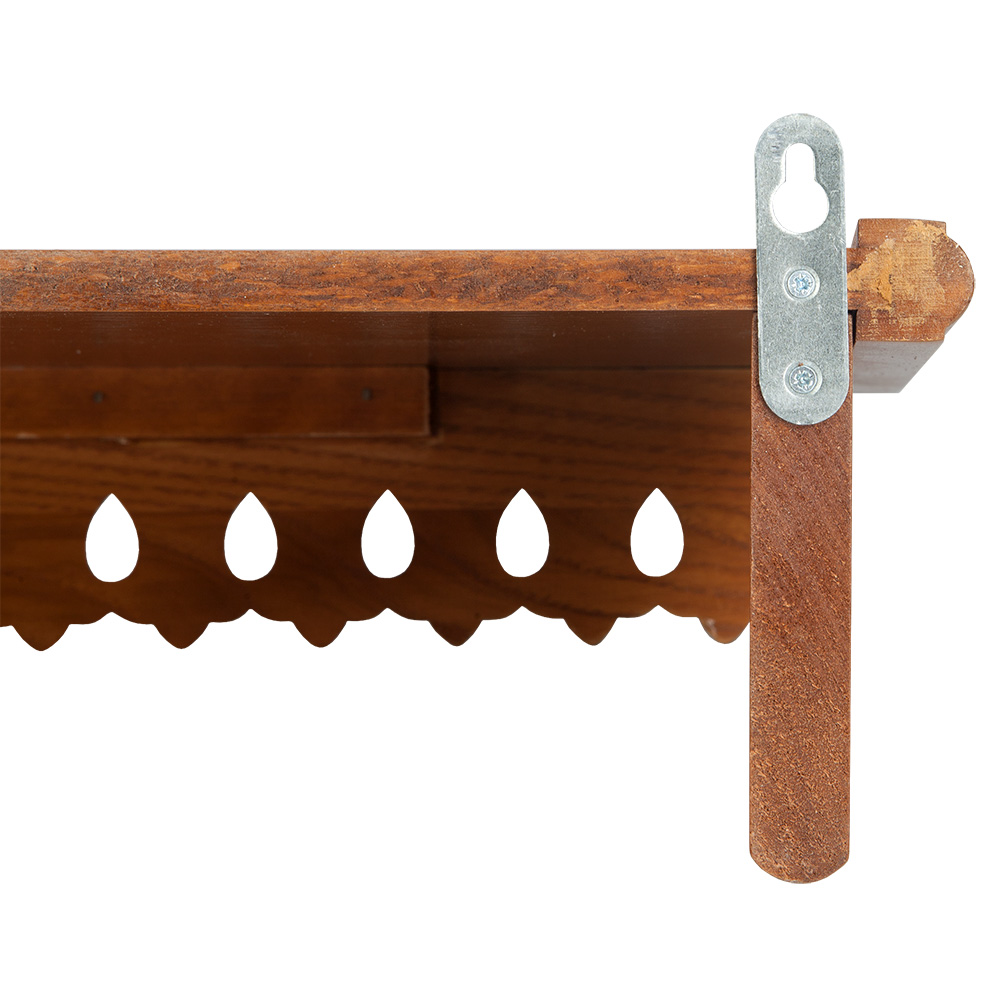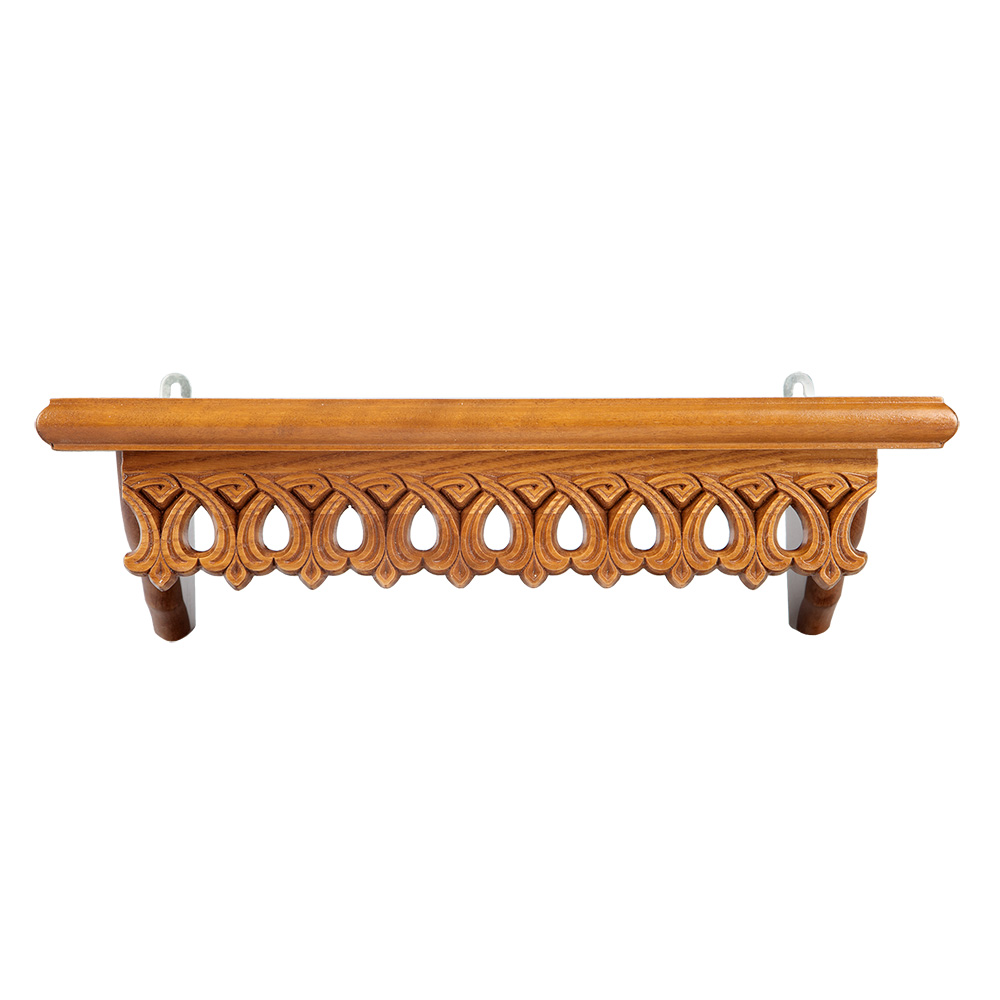 Полка для икон изготовлена из качественной древесины, имеет компактные размеры и небольшой вес. Лицевую часть полки украшает изящная резьба по краю, благодаря которой конструкция выглядит легкой и невесомой. Одноярусная полка легко поместится даже в небольшом пространстве и станет местом благоговейного хранения святых образов.