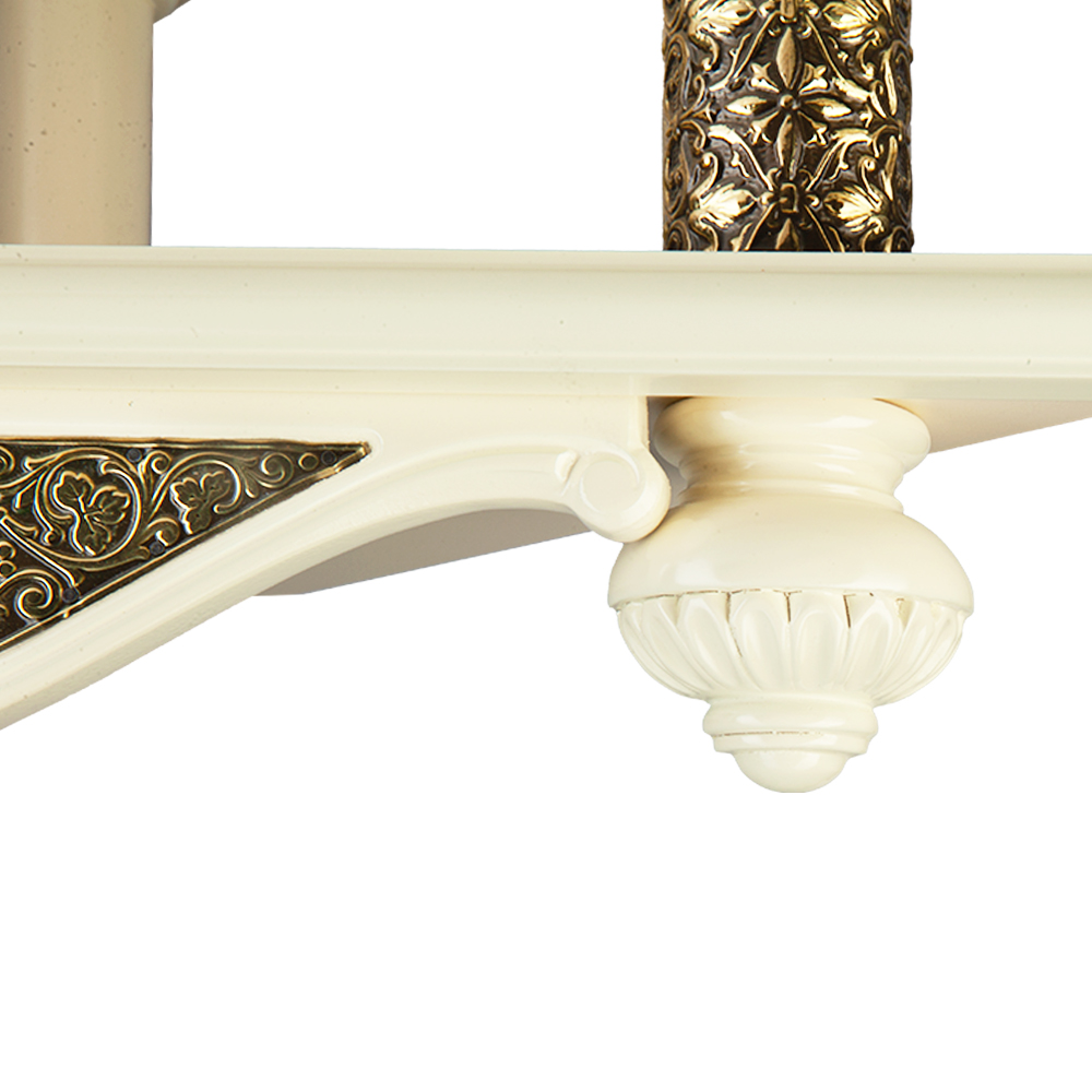 Полка для икон изготовлена из качественной древесины. Двухъярусная конструкция рассчитана на надежную фиксацию и постоянное хранение нескольких икон разного размера. Лицевую часть полки украшают оригинальная резьба и басменный декор. Ярусы полки соединены между собой опорами с наконечниками необычной "луковичной" формы. Данная модель удобна для размещения в углу комнаты благодаря эргономичной кострукции. Полка для икон станет отличным подарком и легко впишется даже в ограниченное пространство.