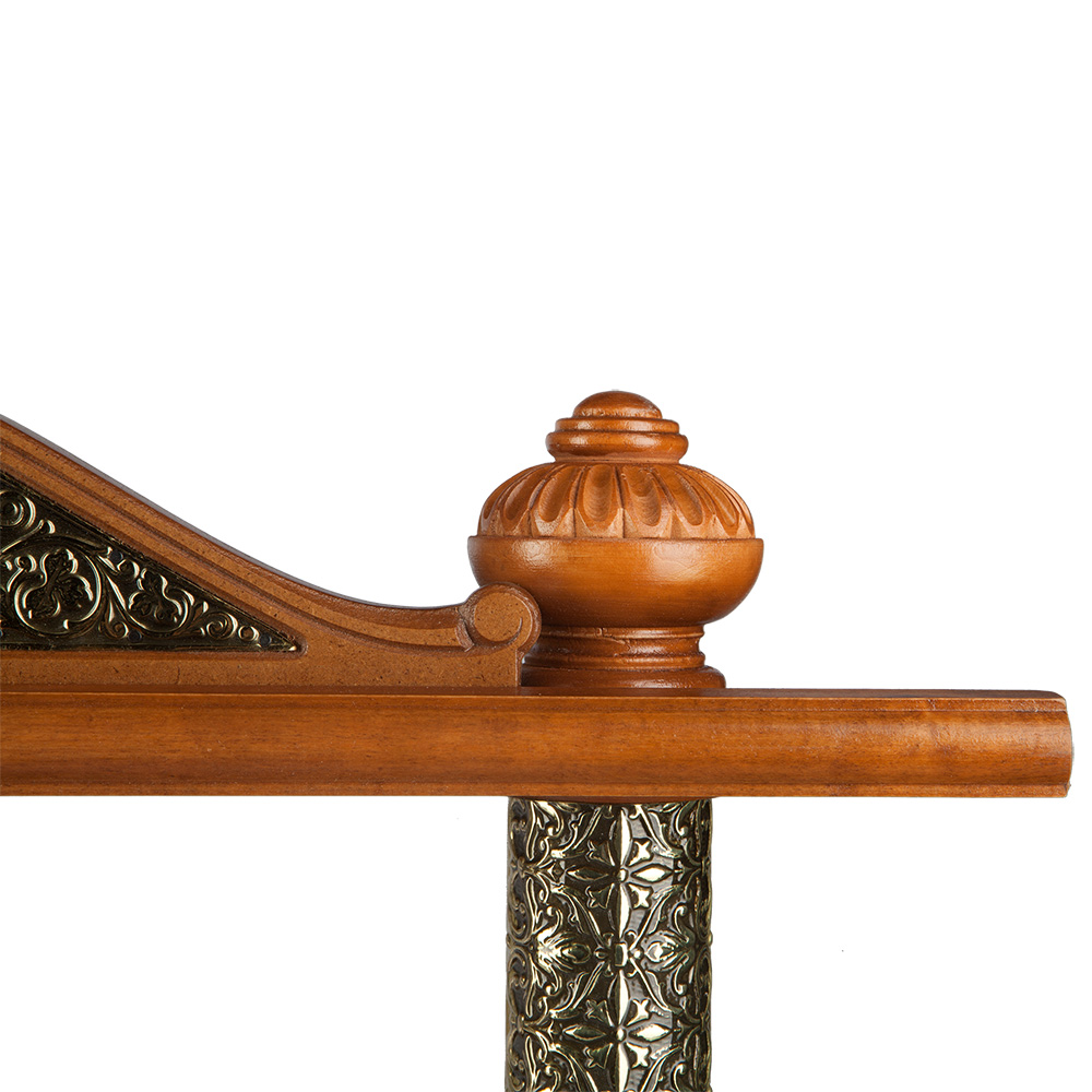 Полка для икон изготовлена из качественной древесины. Двухъярусная конструкция рассчитана на надежную фиксацию и постоянное хранение нескольких икон разного размера. Лицевую часть полки украшают оригинальная резьба и басменный декор. Ярусы полки соединены между собой опорами с наконечниками необычной "луковичной" формы. Данная модель удобна для размещения в углу комнаты благодаря эргономичной кострукции. Полка для икон станет отличным подарком и легко впишется даже в ограниченное пространство.