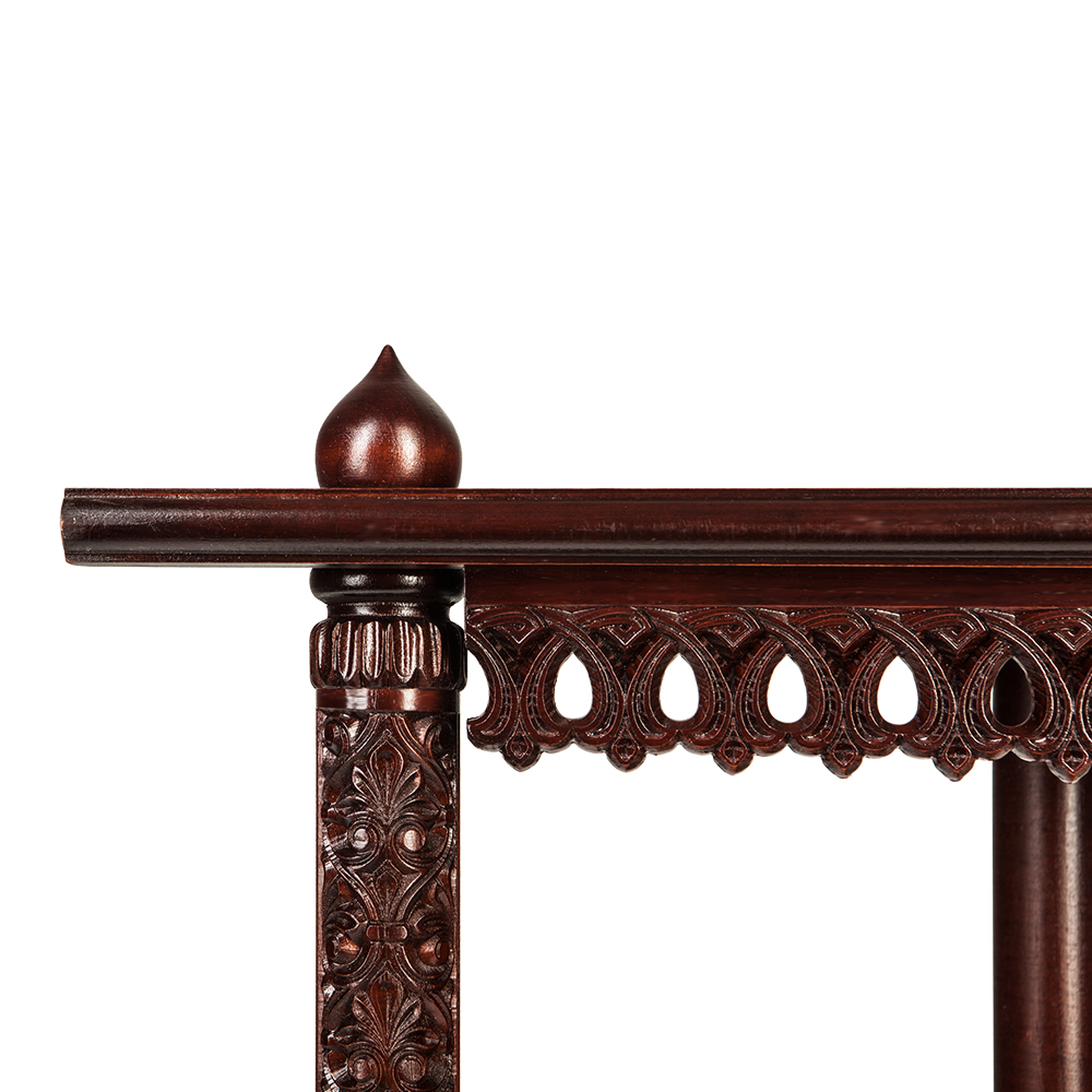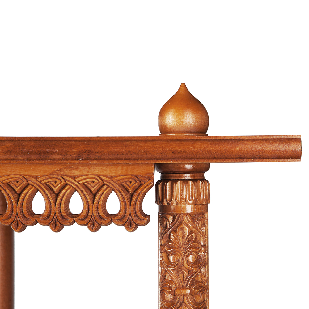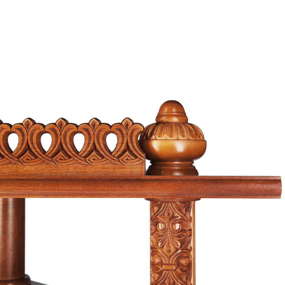 Полка для икон изготовлена из качественной древесины. Трехъярусная конструкция рассчитана на надежную фиксацию и постоянное хранение нескольких икон разного размера. Лицевую часть полки украшает изящная резьба по краю, благодаря которой конструкция выглядит легкой и невесомой. Ярусы полки соединены между собой опорами с наконечниками необычной "луковичной" формы. Данная модель удобна для размещения в углу комнаты благодаря эргономичной кострукции. Полка для икон станет отличным подарком и легко впишется даже в ограниченное пространство.