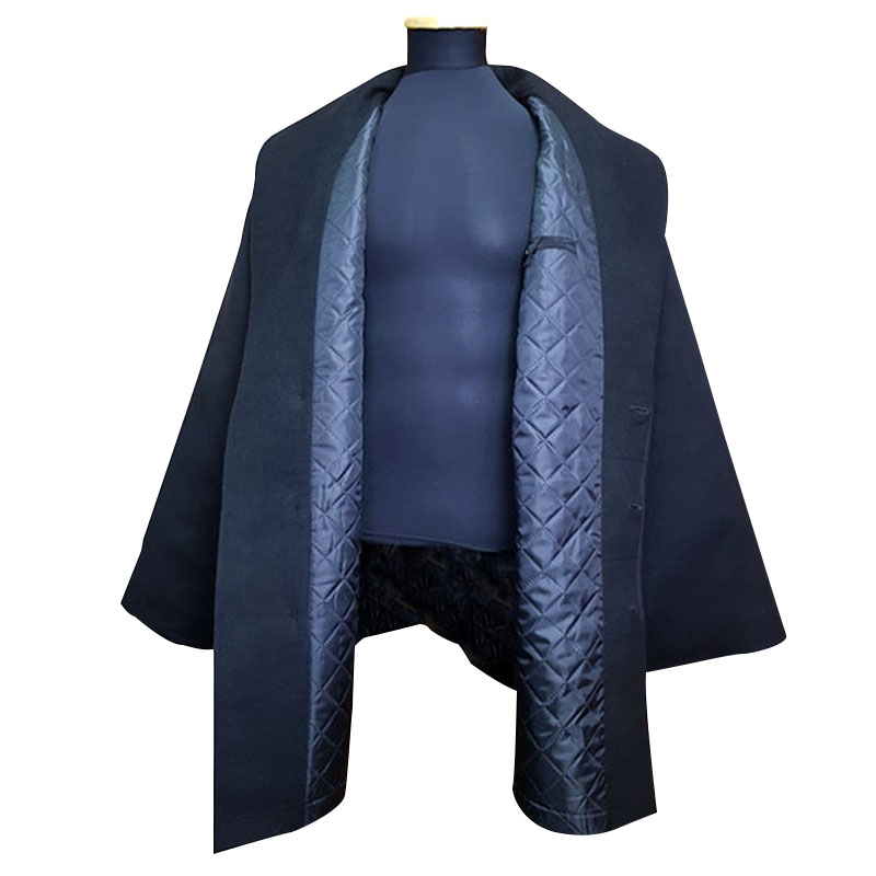 Теплая зимняя полуряса сшита из качественного черного пальтового кашемира. В качестве утеплителя использован синтепон на подкладе (200 г/м²). Предусмотрены два боковых прорезных кармана и потайная застежка. Возможен пошив изделия любого размера на выбор заказчика.
