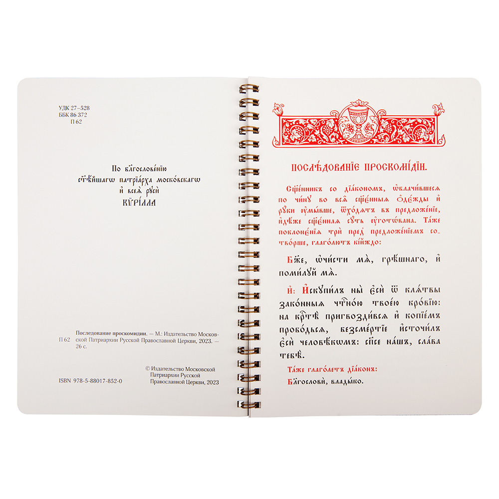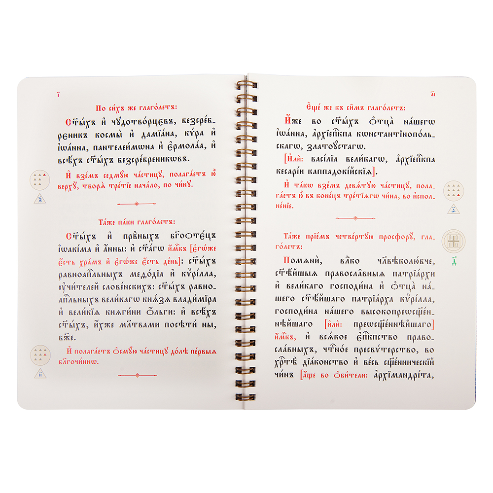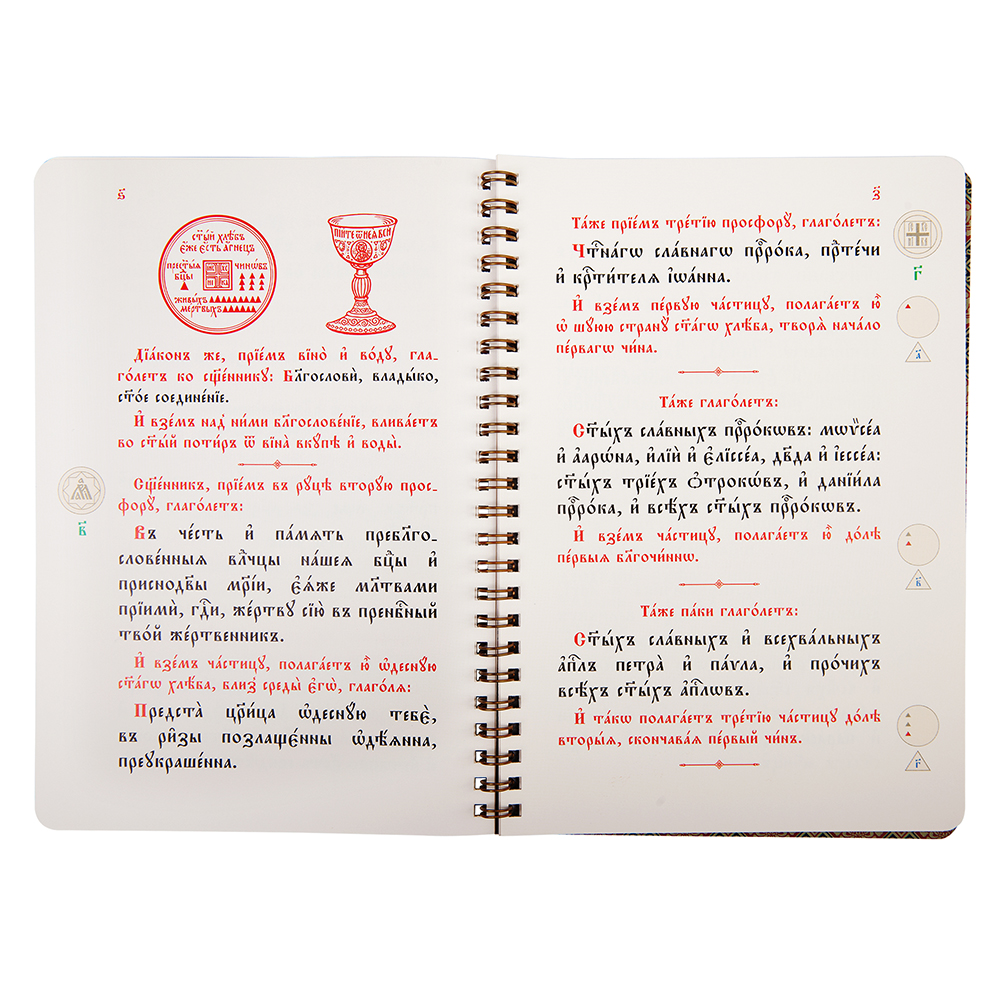 Книга в форме блокнота на прочной металлической пружине станет незаменимым помощником при совершении проскомидии для тех, кто только начинает священническое служение. Удобный формат позволяет легко открыть издание на нужной странице и не переживать, что оно закроется в неподходящий момент, как это часто происходит со служебниками в твердом переплете.