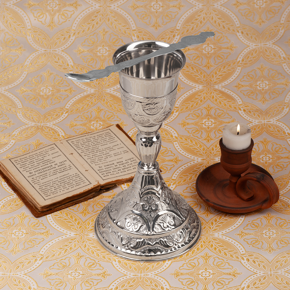 Потир изготовлен из двух разных видов сплавов. Для чаши потира использована нержавеющая сталь, для основания – латунный сплав, покрытый тонким слоем никеля. Защитное покрытие по технологии никелирования придает изделию сдержанный внешний вид и привлекательный блеск. Оригинальный узор на поверхности изделия нанесен по технологии чеканки.