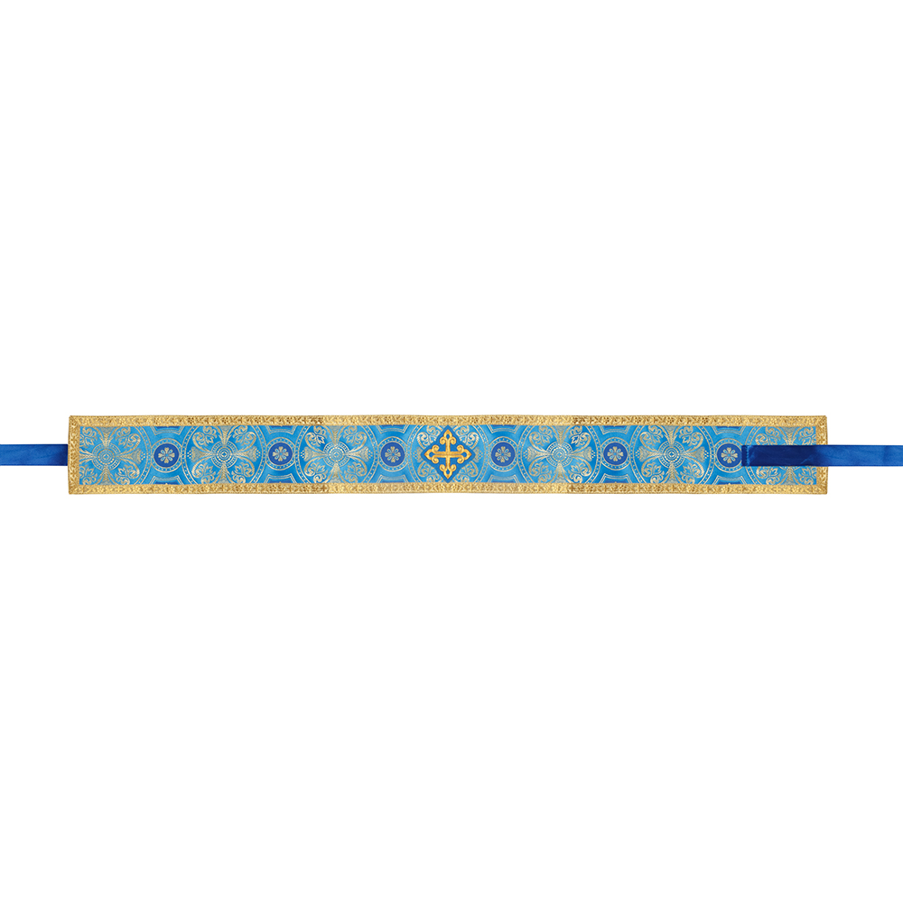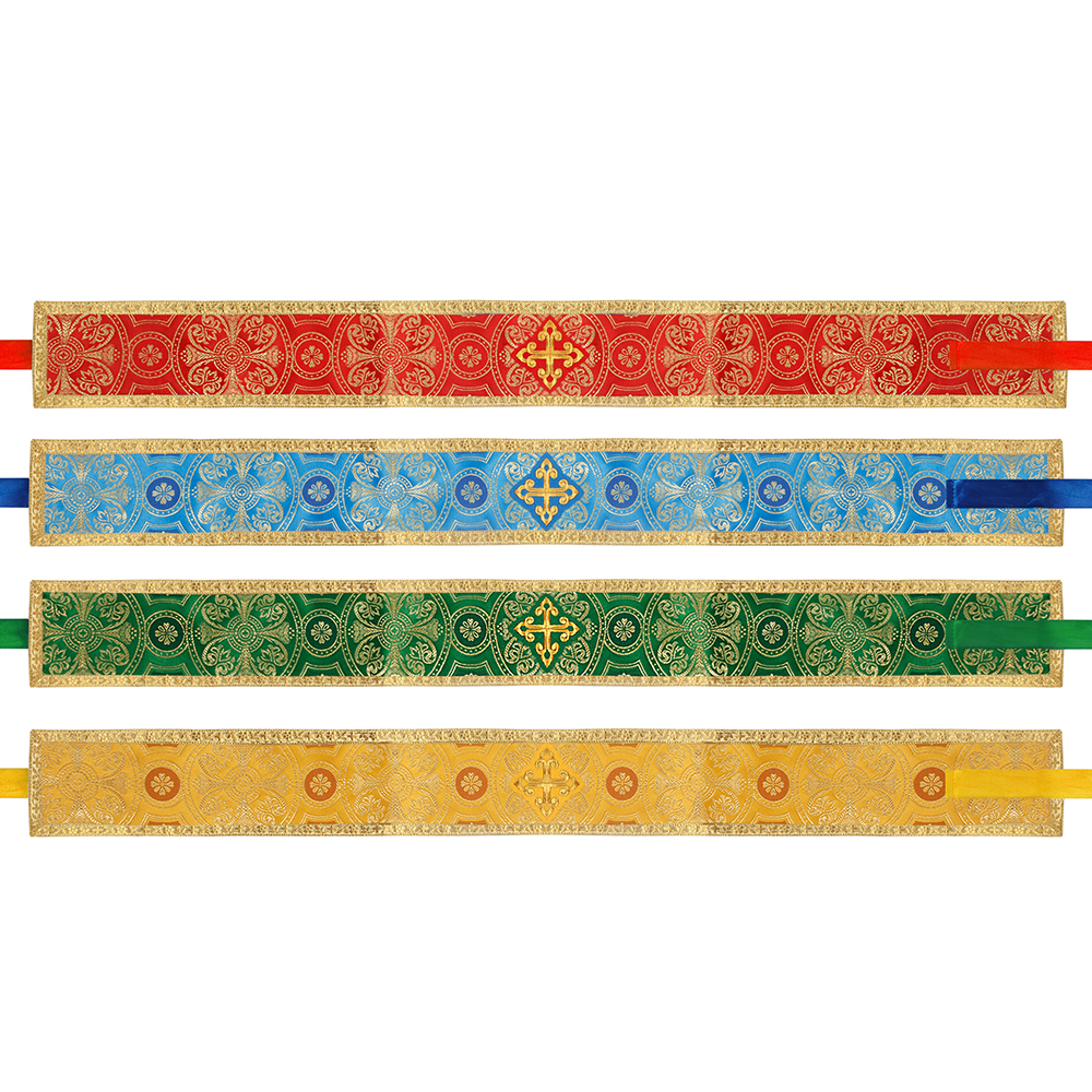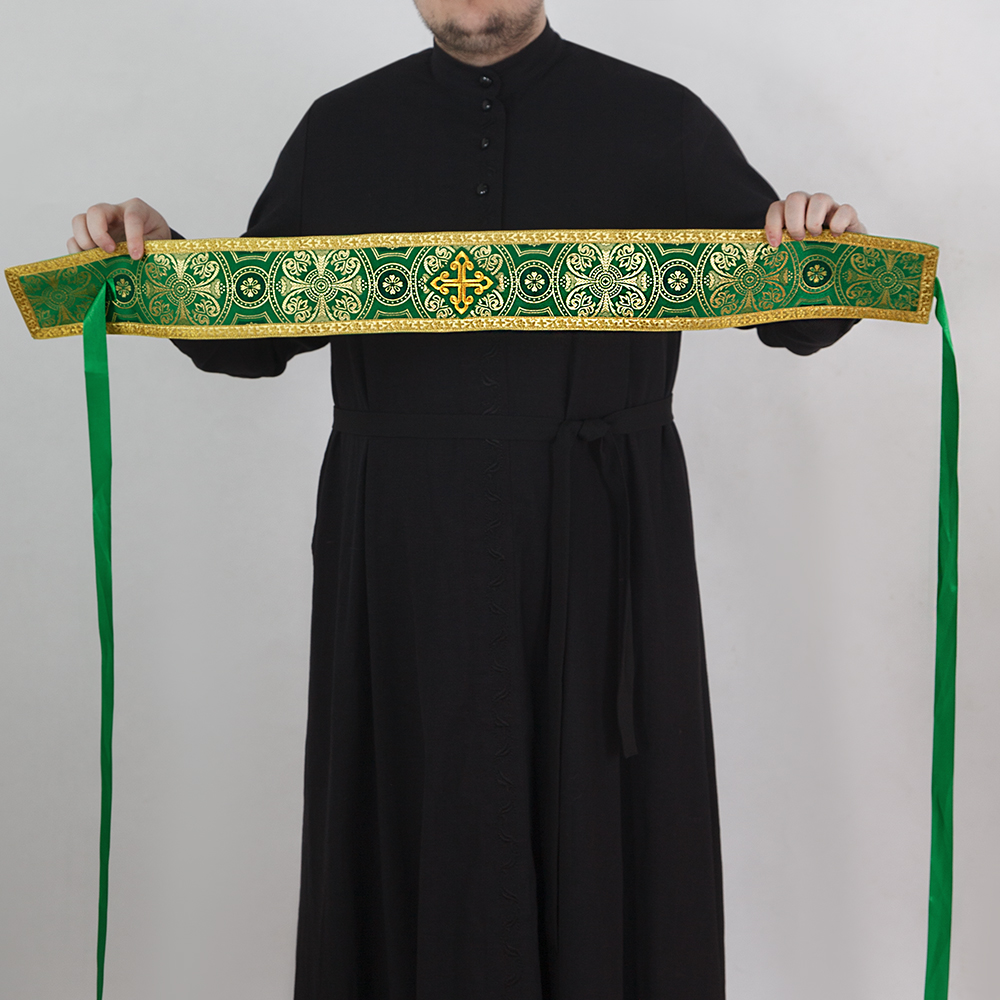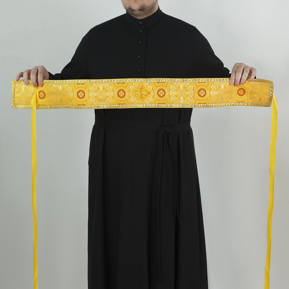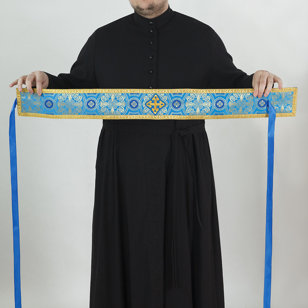 Иерейский пояс сшит из церковного шелка и уложен на подклад из креп-сатина. На лицевую часть нашит накладной крест, вышитый на машинке, края обработаны галуном. Для застежки предусмотрена длинная атласная лента в тон ткани. В наличии представлены изделия разных цветов согласно принятой символике богослужебных облачений, при оформлении заказа укажите желаемый цвет модели.