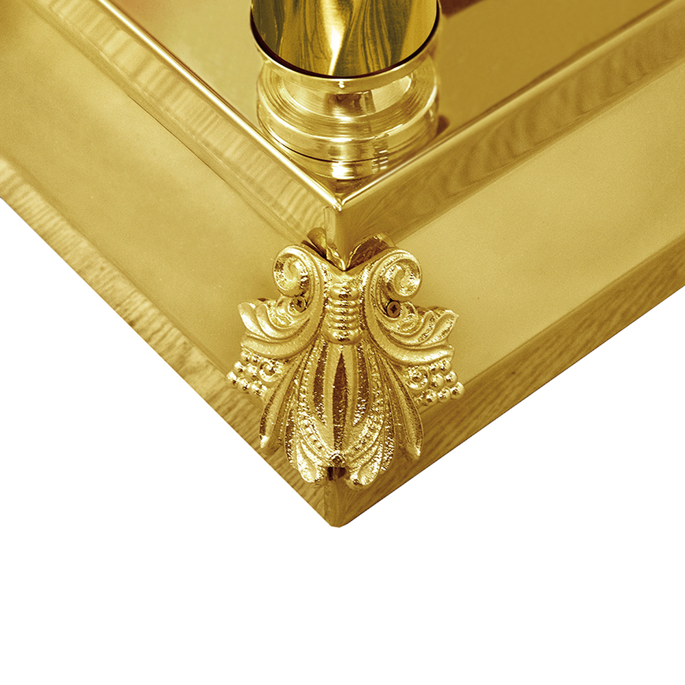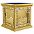 Облачение на престол «Золотые своды» изготовлено из нержавеющей стали с напылением нитрида титана. Столешницу закрывает плотная мебельная ткань, основанием выступает прочная конструкция из ДСП. В качестве декора использованы литые декоративные накладки с покрытием цветной эмалью. Стороны облачения украшают объемные иконы-барельефы. При оформлении заказа на облачение укажите желаемый цвет мебельной ткани и размер конструкции, выбрав один из доступных вариантов.