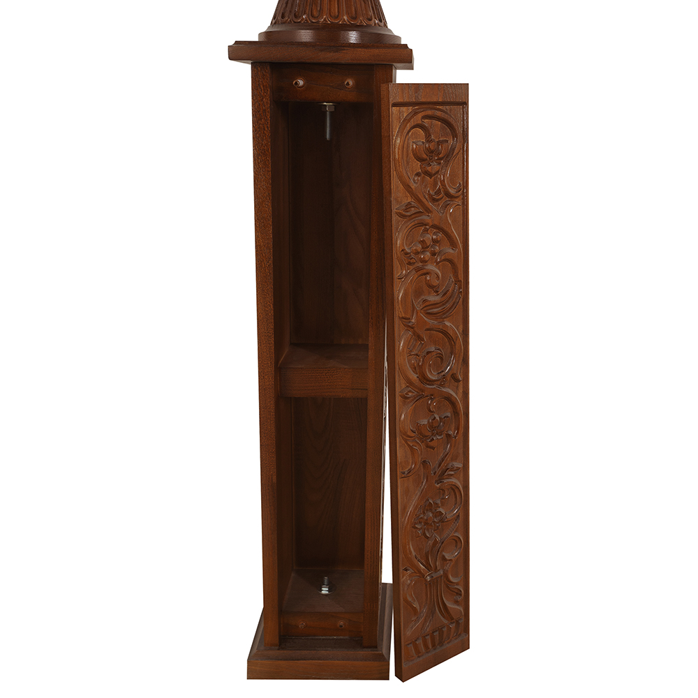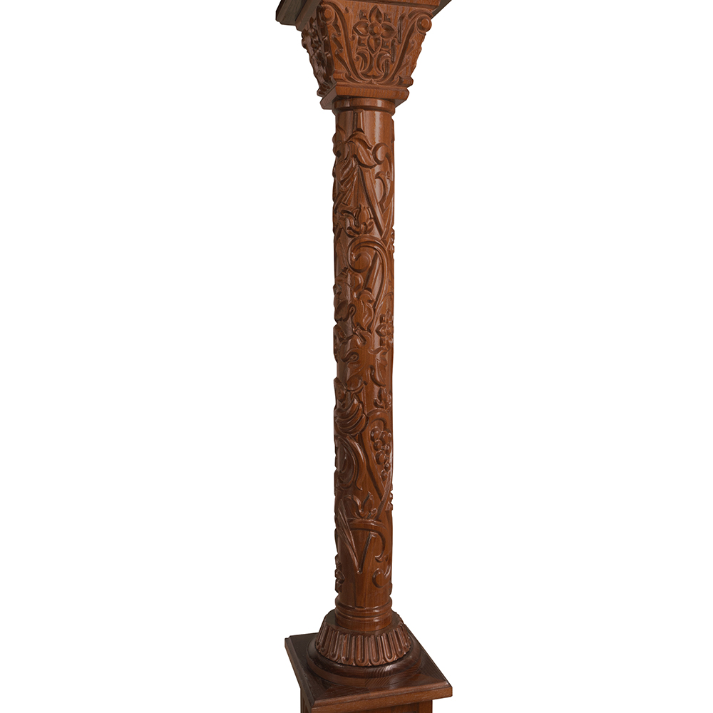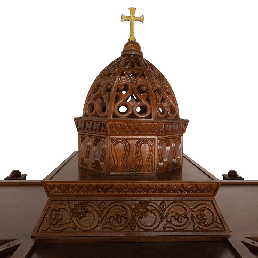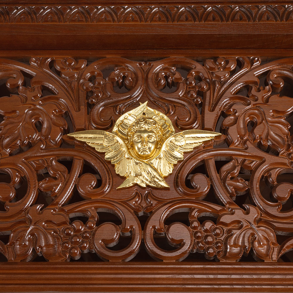 Облачение на престол вырезано из древесины ясеня. Его основным украшением служит декоративная резьба в виде орнамента из виноградных лоз, а также покрытие поталью для выделения объемных деталей узора. В центре лицевой части помещено иконописное изображение "Успение Божией Матери", напечатанное на золотом холсте. Оттенок "кипарис с золотом" - универсальное решение, подходящее под обстановку любого храма.