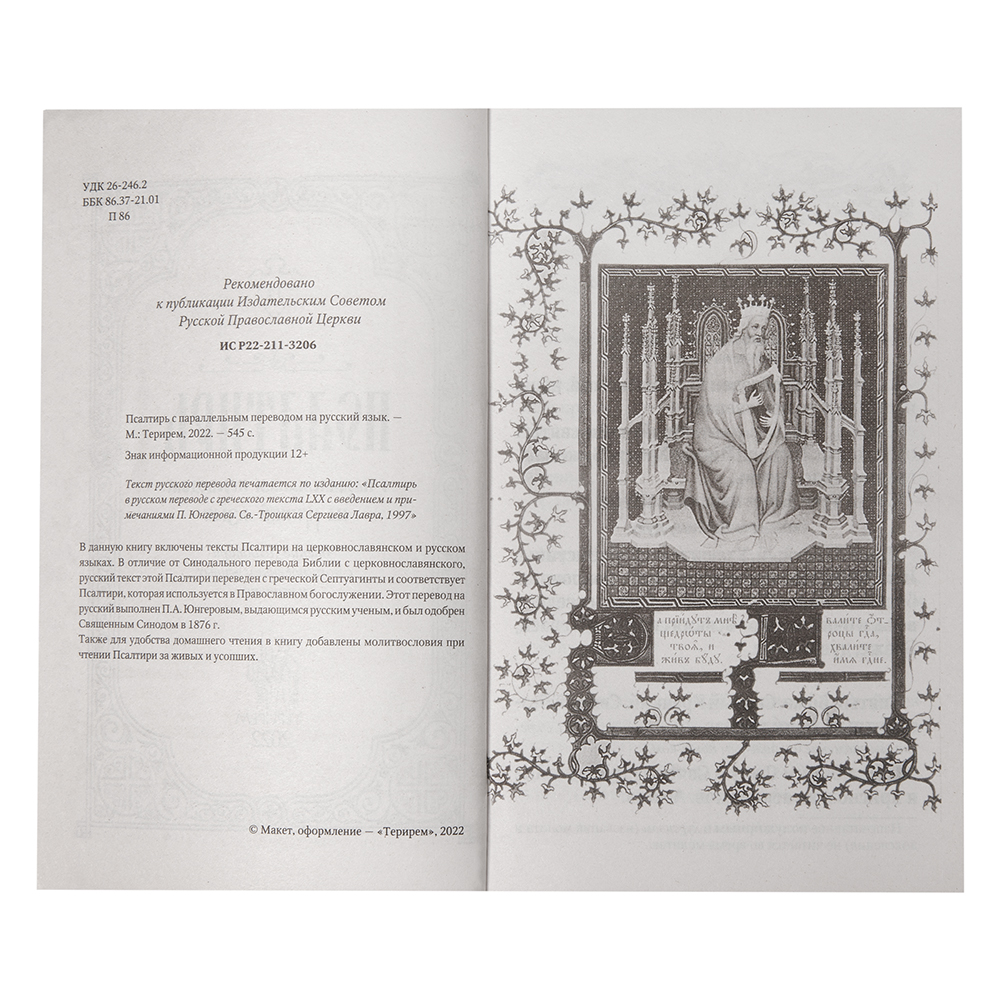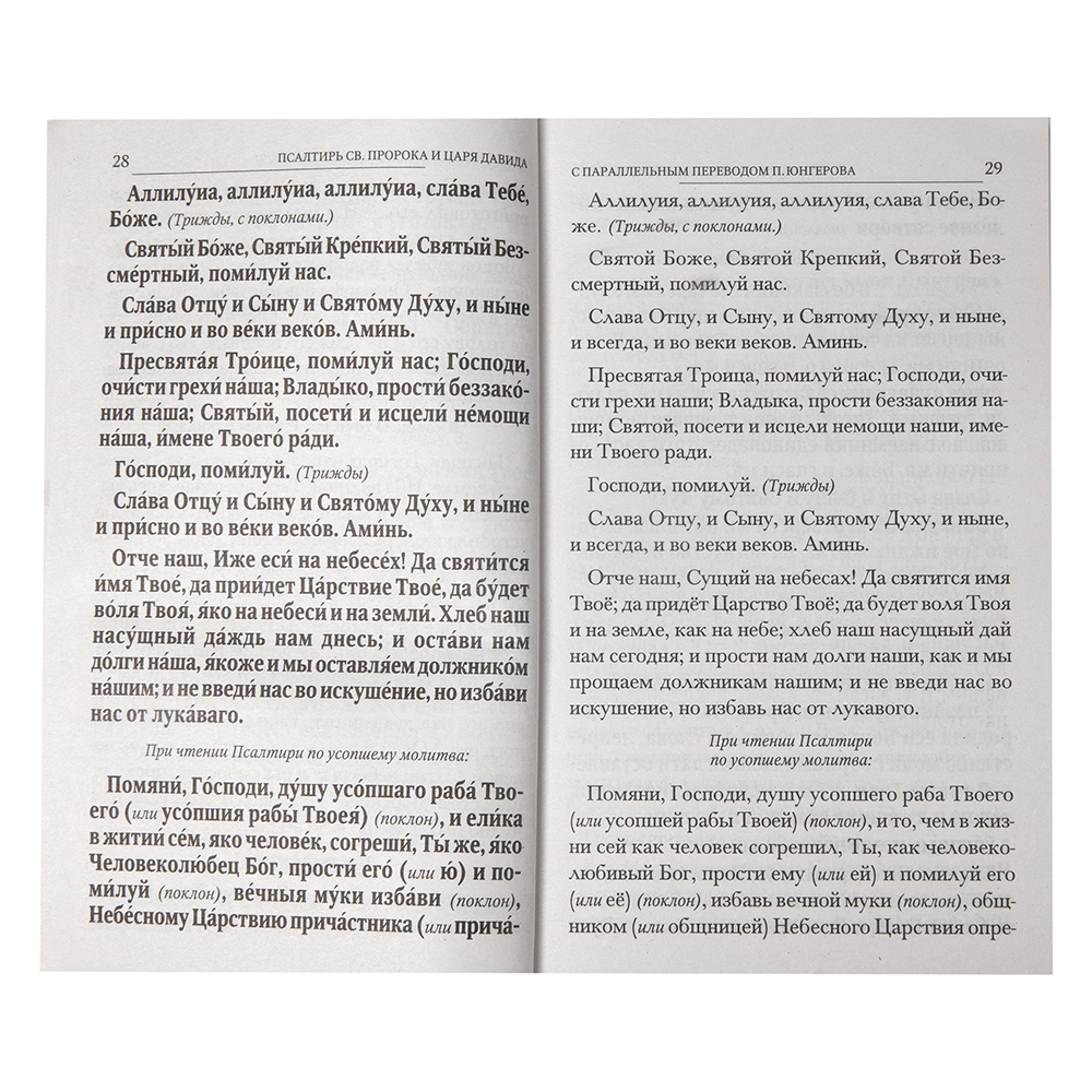 В книге вниманию читателей предлагаются тексты Псалтири на церковнославянском и русском языках, что значительно упрощает понимание молитвенных прошений. Важно: русский текст подготовлен не на основе Синодального перевода, а взят с греческой Септуагинты (LXX) и точно соответствует богослужебной Псалтири, которая прочитывается в храмах во время треб и служб. Подготовку перевода на русский язык выполнил известный русский ученый П.А. Юнгеров, и благодаря профессиональному изложению библейских текстов его труды получили полное одобрение Синода.