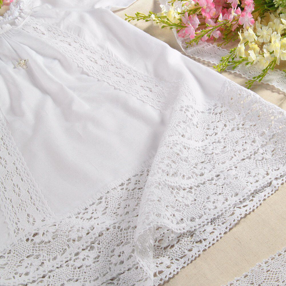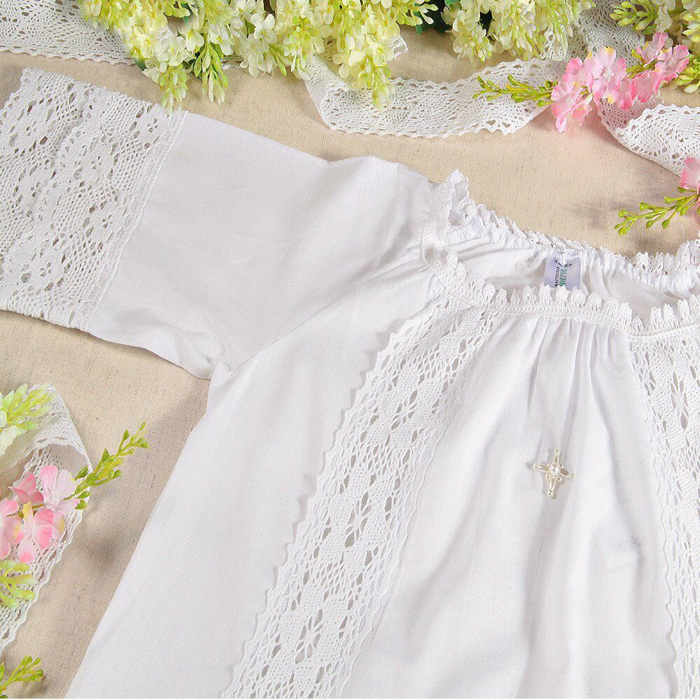 Крестильная рубашка из тонкого муслина предназначена для малышей 1,5-2,5 года. Натуральный материал обладает гипоаллергенными свойствами, а аккуратные швы пройм не натирают нежную детскую кожу. Подол, рукава и полочка украшены ажурными вставками из хлопчатобумажного кружева. Возле горловины бусинами искусственного жемчуга вышит равносторонний крест.