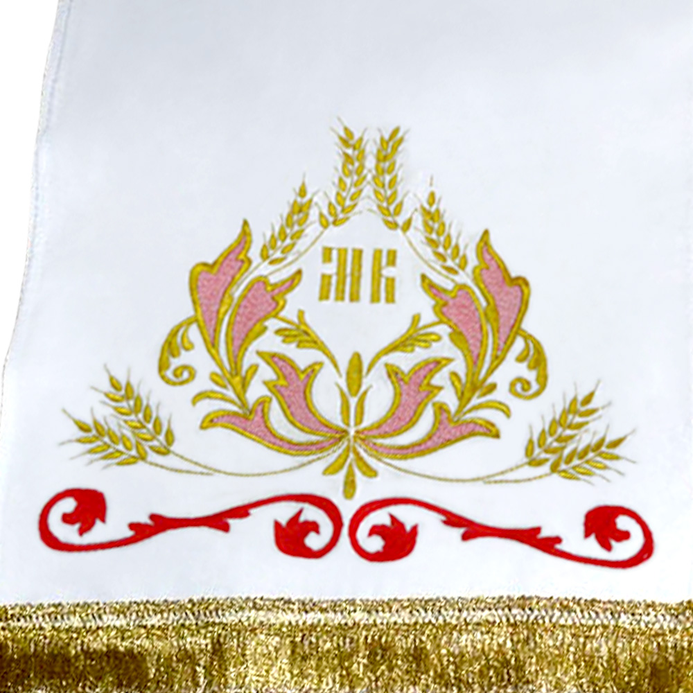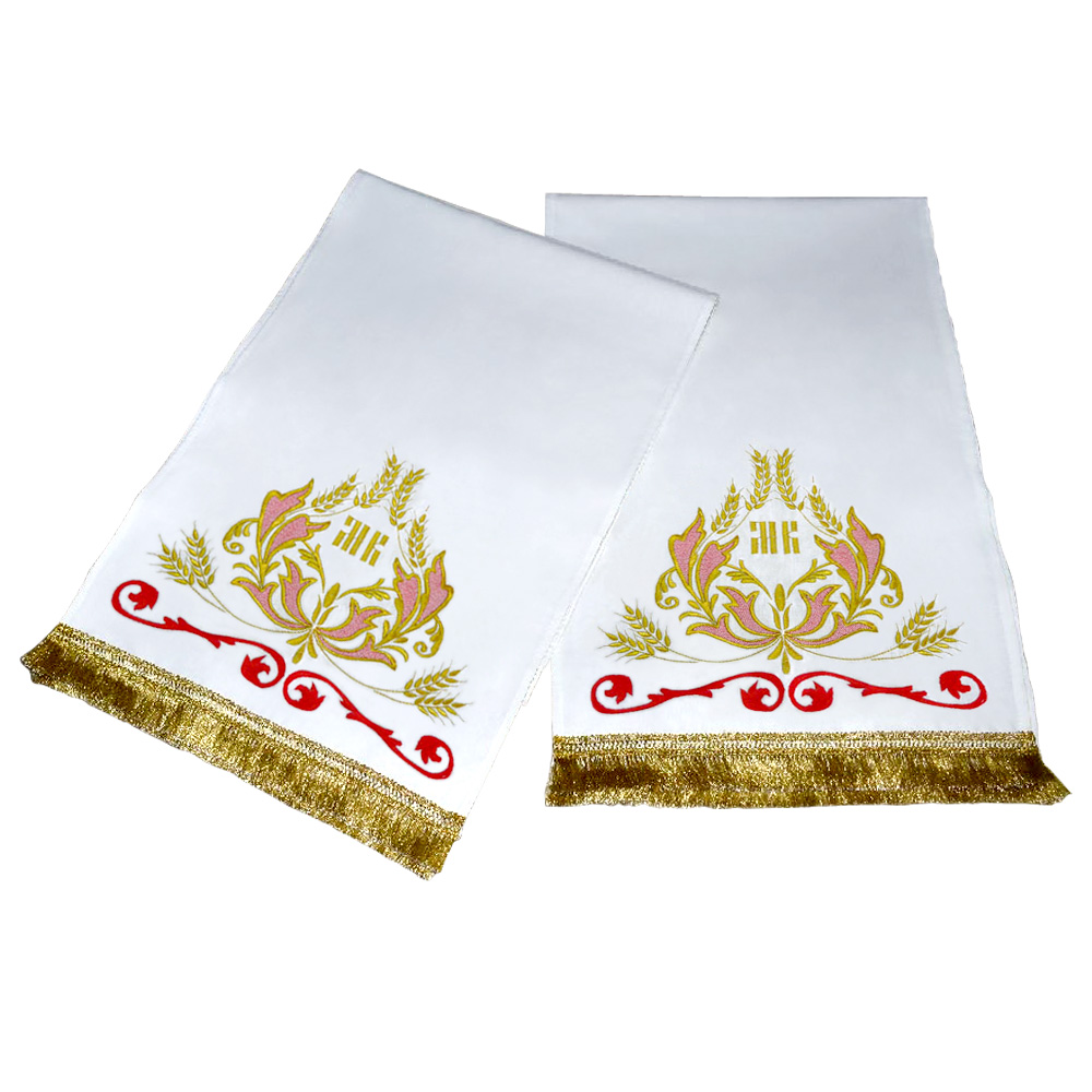 Белоснежный рушник по традиции подается архиерею после омовения рук перед совершением богослужения. Изделие шьют из бязи или хлопковой ткани на выбор заказчика. Его основным украшением является двусторонняя вышивка короны из цветочного орнамента и хлебных колосьев, выполненная золотыми или серебряными нитками с дополнительным цветом – бордовым, голубым или красным на выбор. Внутри короны вышиты две литеры, обозначающие статус и имя духовного лица. По краю изделие украшено бахромой, подобранной в цвет вышивки.