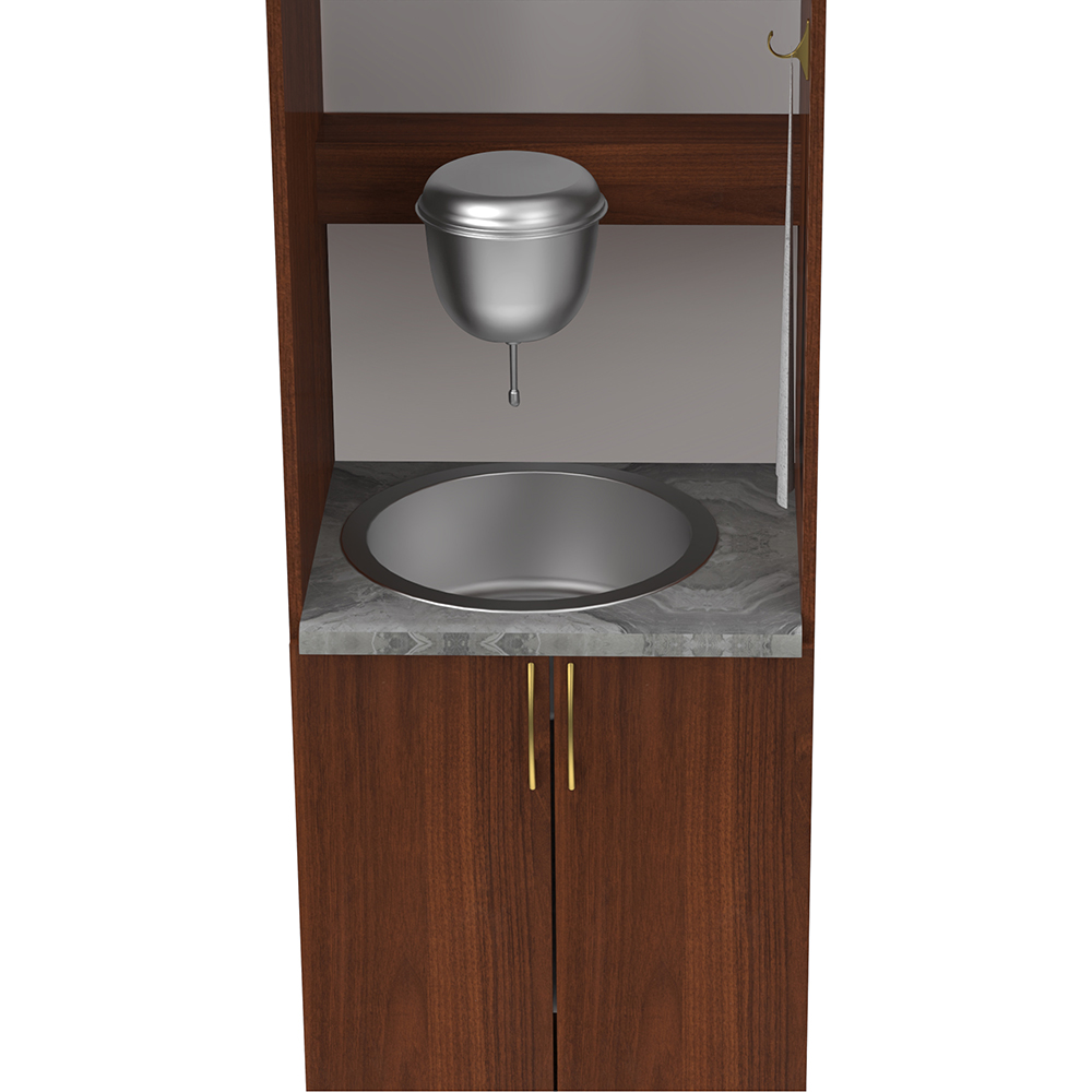 Шкаф под рукомойник серии «Самарская» изготовлен из качественных плит ЛДСП. В высокой компактной конструкции предусмотрено все необходимое для омовения рук – подвешивание рукомойника, крючок для рушника, полки для хранения необходимых принадлежностей и вместительный ящик под ведро для сбора сточной воды. Немаркая отделка стены и столешницы у рукомойника не требует сложного ухода и легко очищается от капель воды. Модель представлена в белом цвете и цвете «ноче экко».