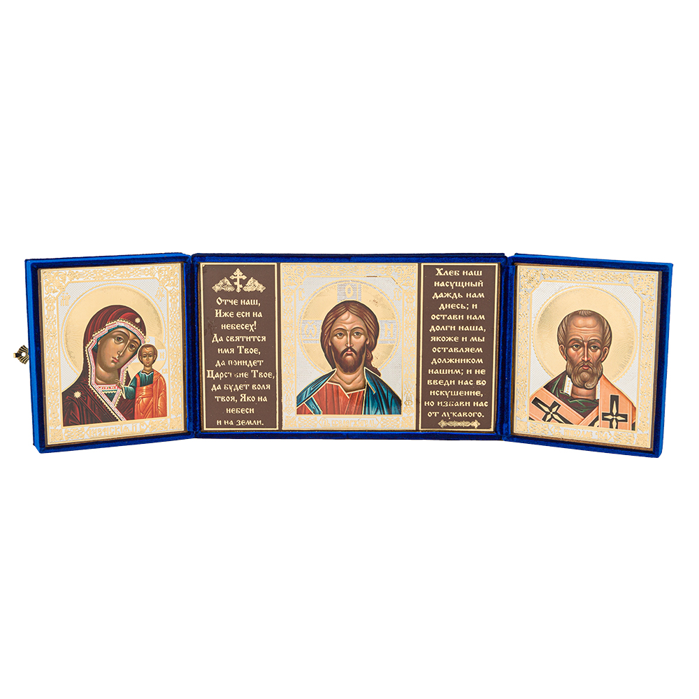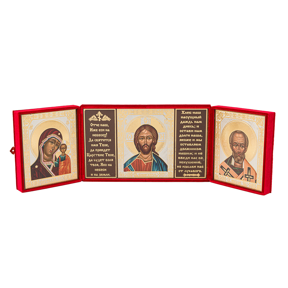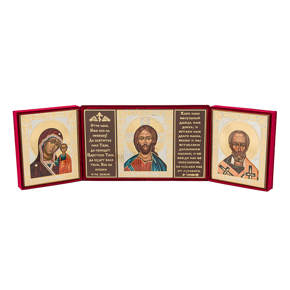 Складень с ликами Спасителя, Божией Матери "Казанская" и святителя Николая Чудотворца, 28х16,5 см, бархат