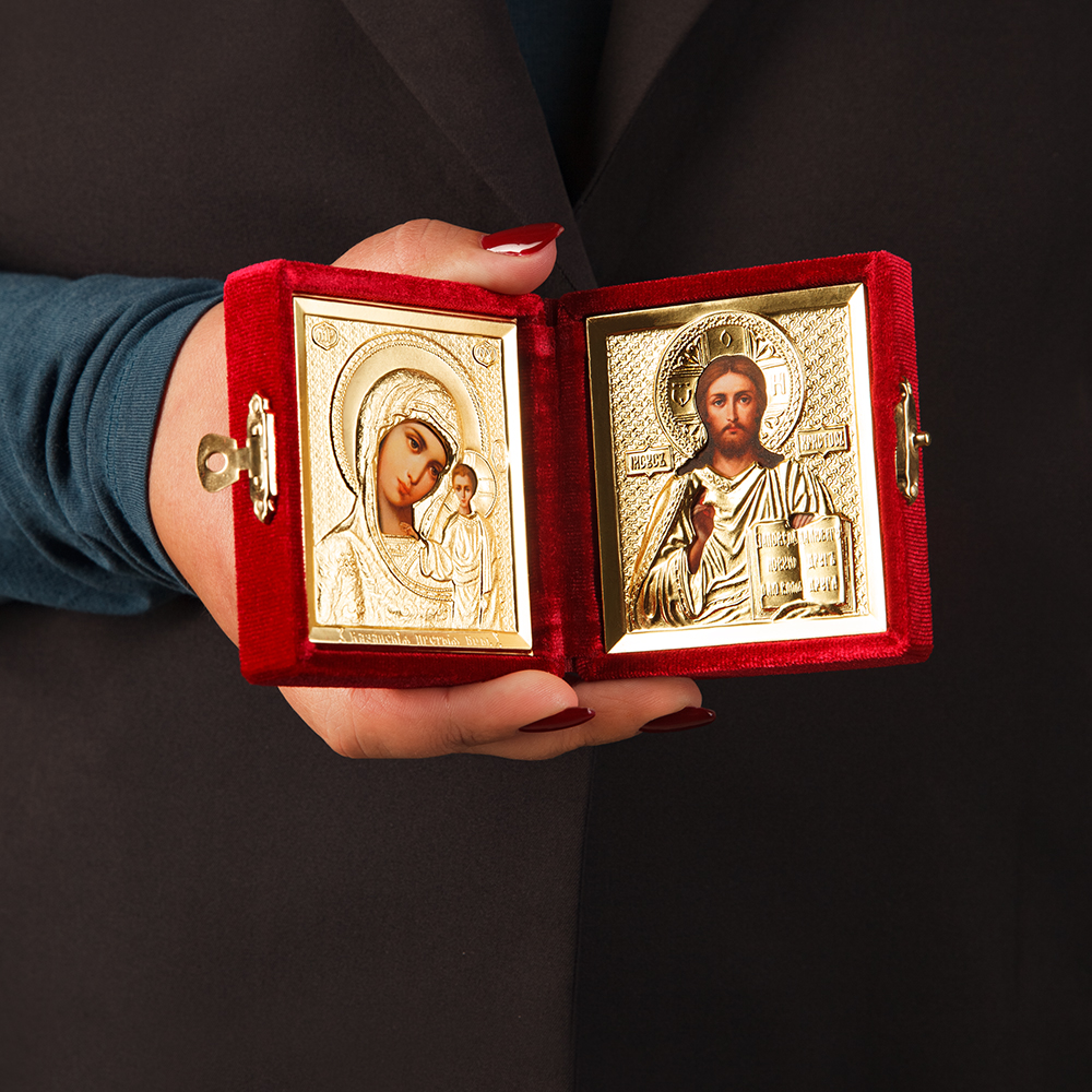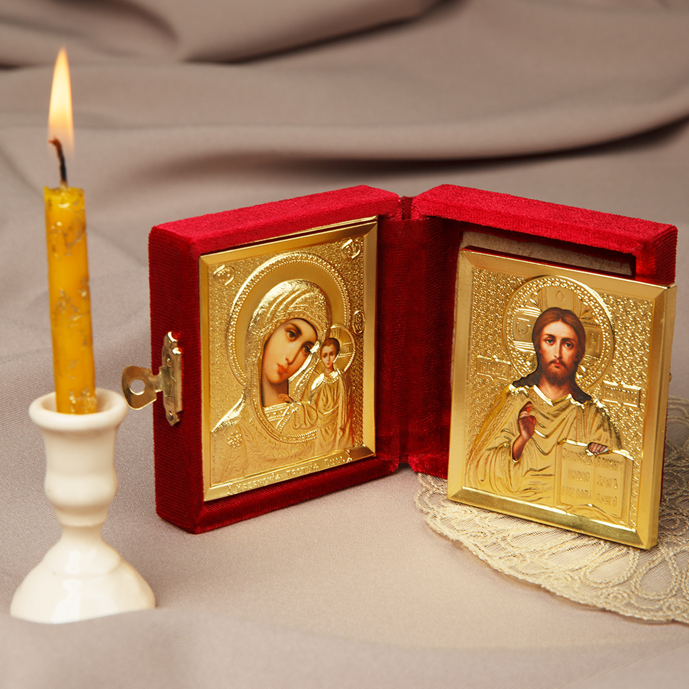 Маленький складень будет сопровождать вас во время путешествия, займет достойное место на рабочем столе или полке для икон. Модель изготовлена в виде плоского футляра, обшитого бархатом. Половинки легко закрываются на удобный металлический замок-защелку, что поможет защитить иконы от случайной порчи и аккуратно носить складень в небольшой сумке. Плотная основа выдержит неблагоприятное воздействие без повреждений и деформации. А бархатную обивку несложно привести в порядок методом сухой чистки.