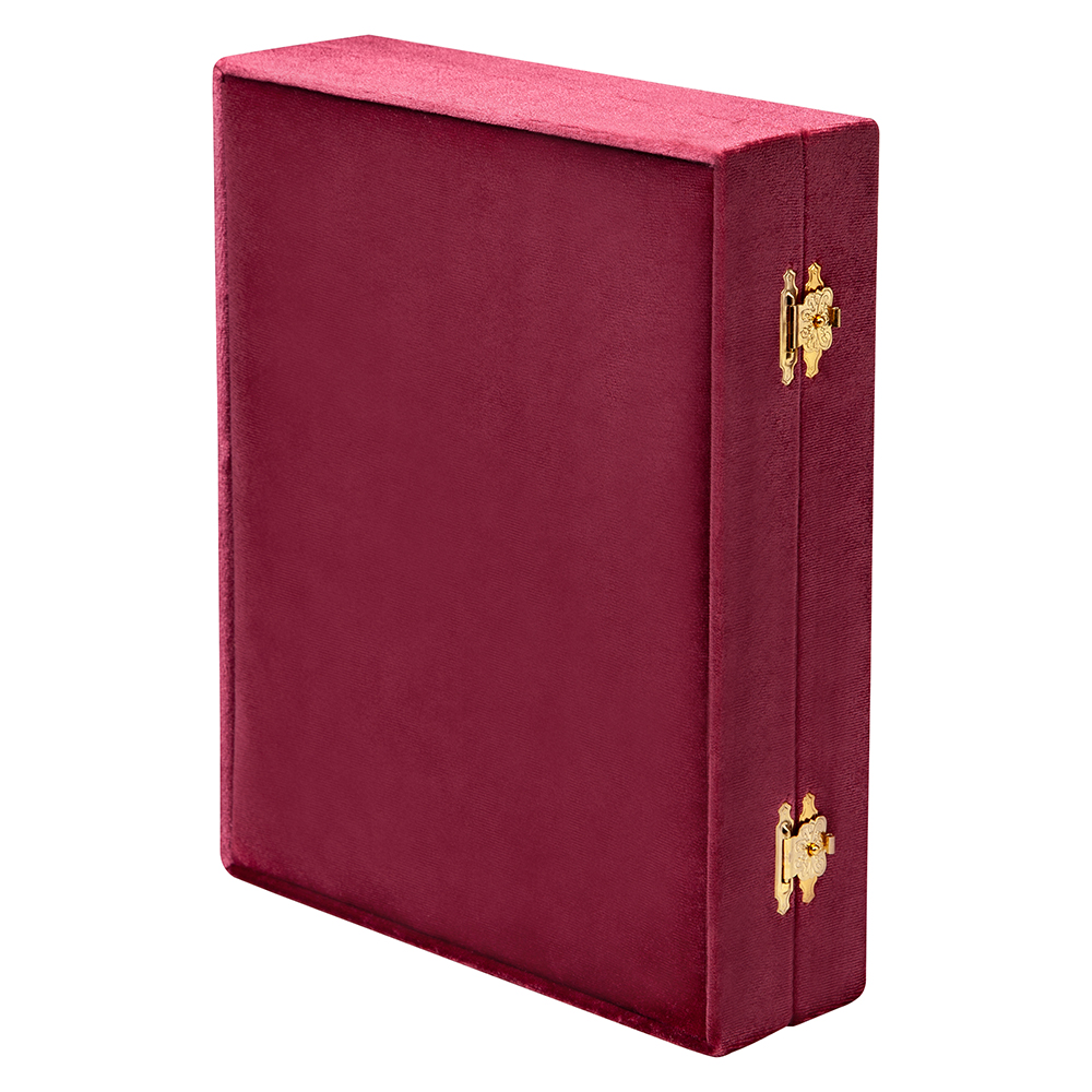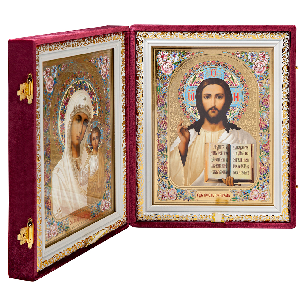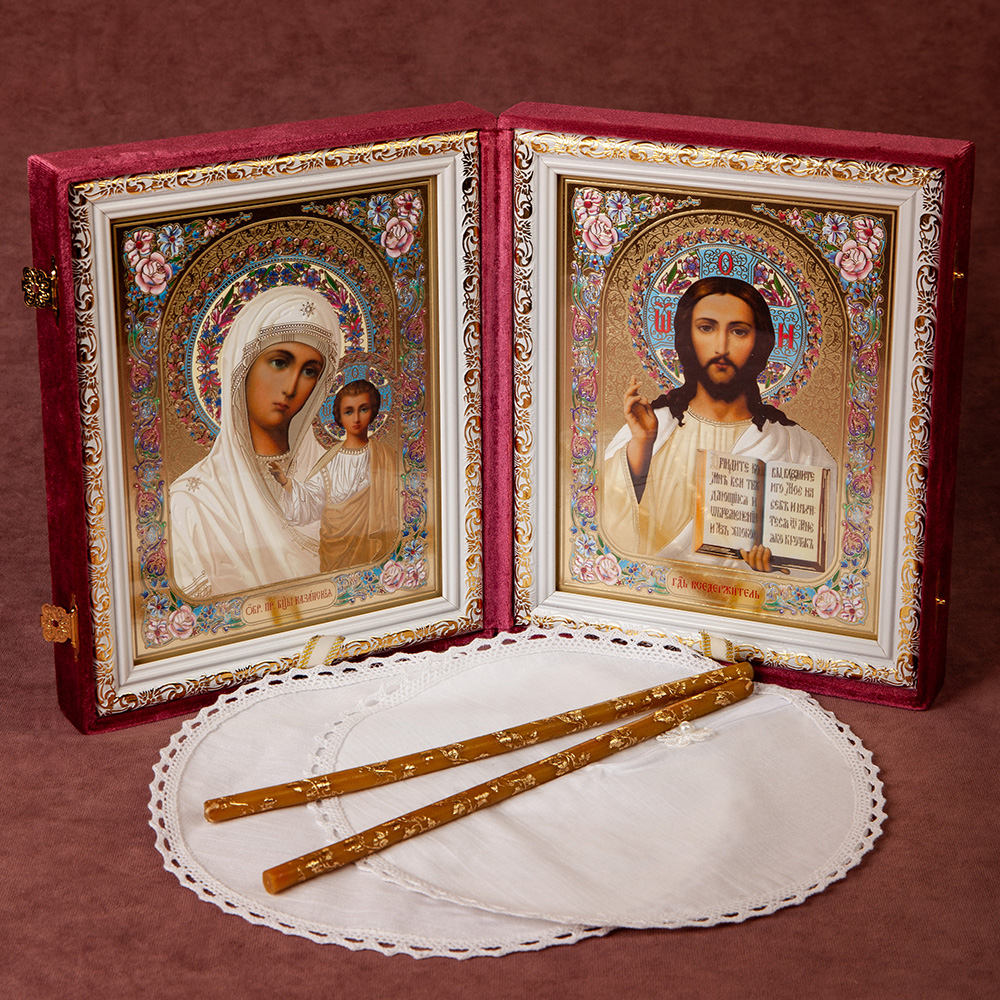 Венчальные иконы с ликами Спасителя и Божией Матери будут сопровождать супружескую пару на всем протяжении их совместной жизни. Изделия изготовлены в виде складня – плоского футляра с бархатной обивкой. На внутренней стороне помещены образа в современном или традиционном византийском или академическом стиле письма. Модель удобно складывается и закрывается на небольшой металлический замок-защелку.