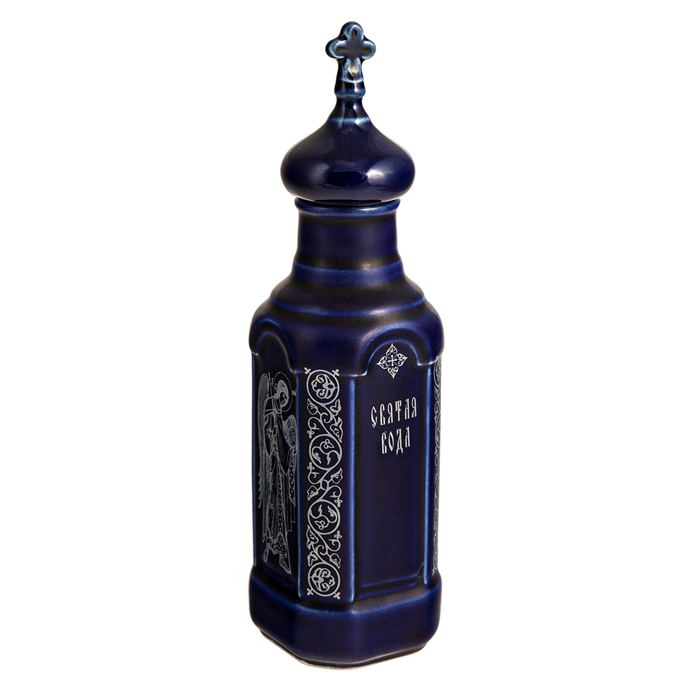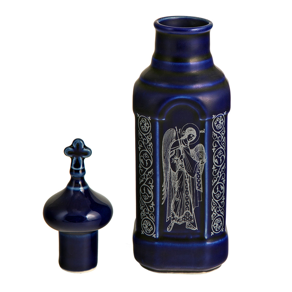 Керамический синий сосуд с серебристой росписью "Серебряный ангел". На одной из граней сосуда текст молитвы "Господи Боже мой, да будет дар Твой святый и святая Твоя вода в просвещение ума моего, в укрепление душевных и телесных сил моих, во здравие души и тела моего, в покорение страстей и немощей моих по беспредельному милосердию Твоему молитвами Пречистыя Твоея Матери и всех святых Твоих. Аминь."