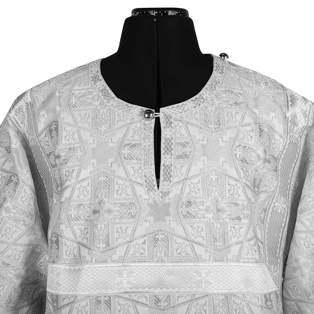 Стихарь алтарника сшит из парчи белого цвета с рисунком. В качестве основного украшения изделия выступает серебристый галун. Нашивной крест на спинке вышит металлической нитью.