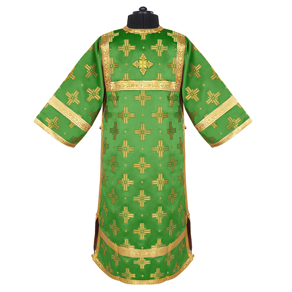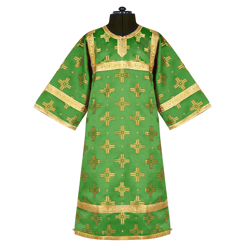 Детский стихарь алтарника в разных вариантах размеров из полиэфирного шелка «Святительский» в цвете "зеленый с золотом" с отделкой галуном в тон ткани, металлическими пуговицами и накладным крестом.