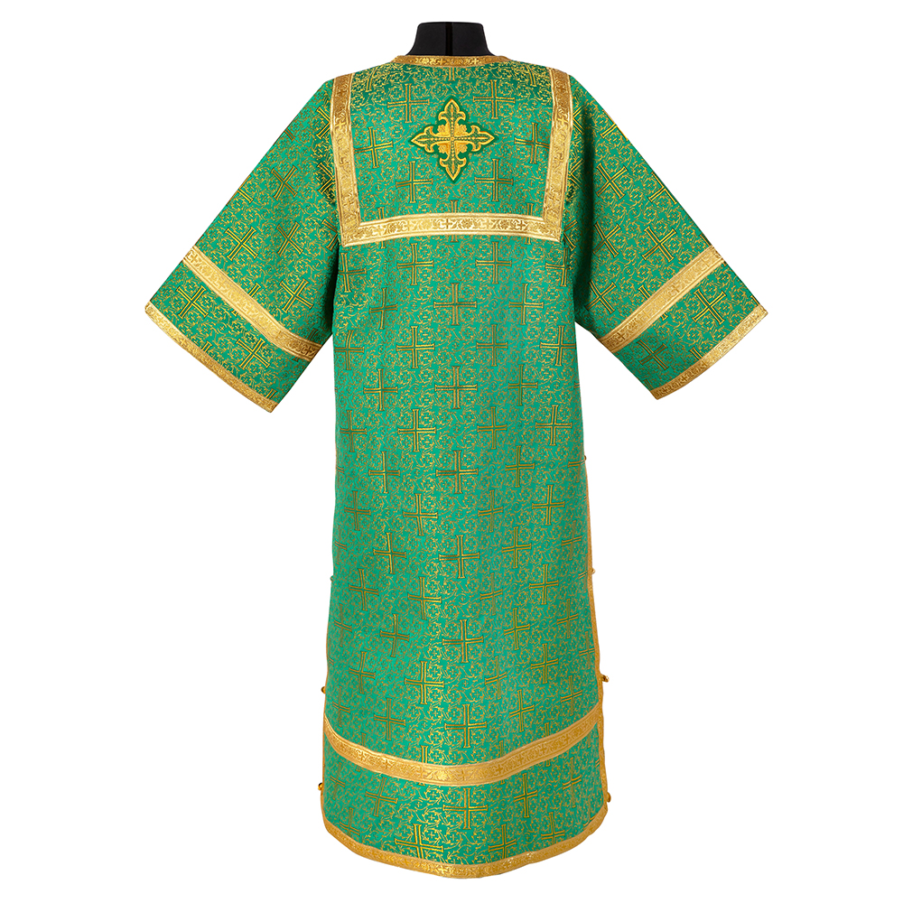 Стихарь алтарника из парчи "Афон" в цвете "зеленый с золотом", отделкой крестом и галуном.