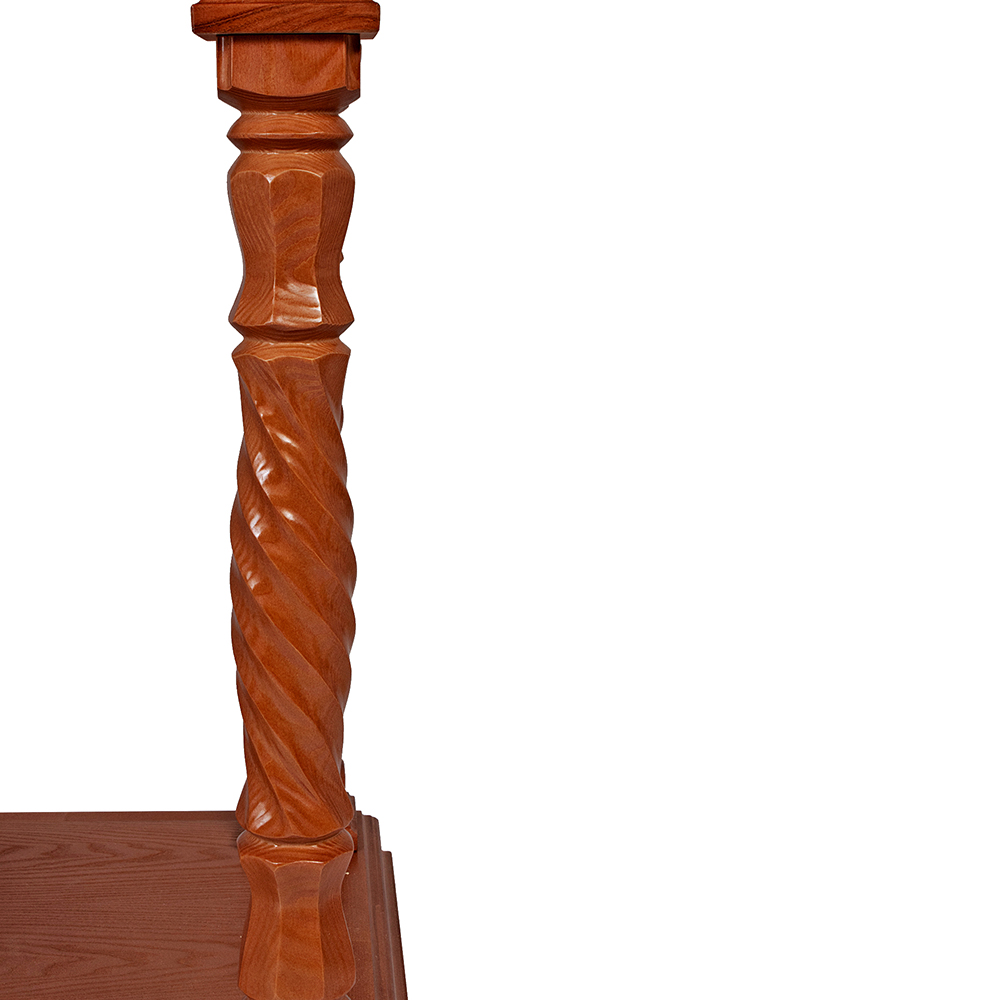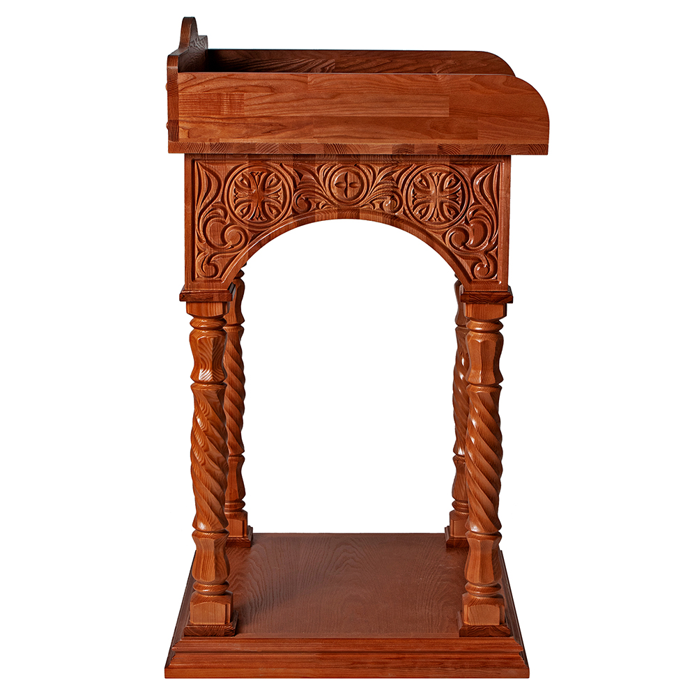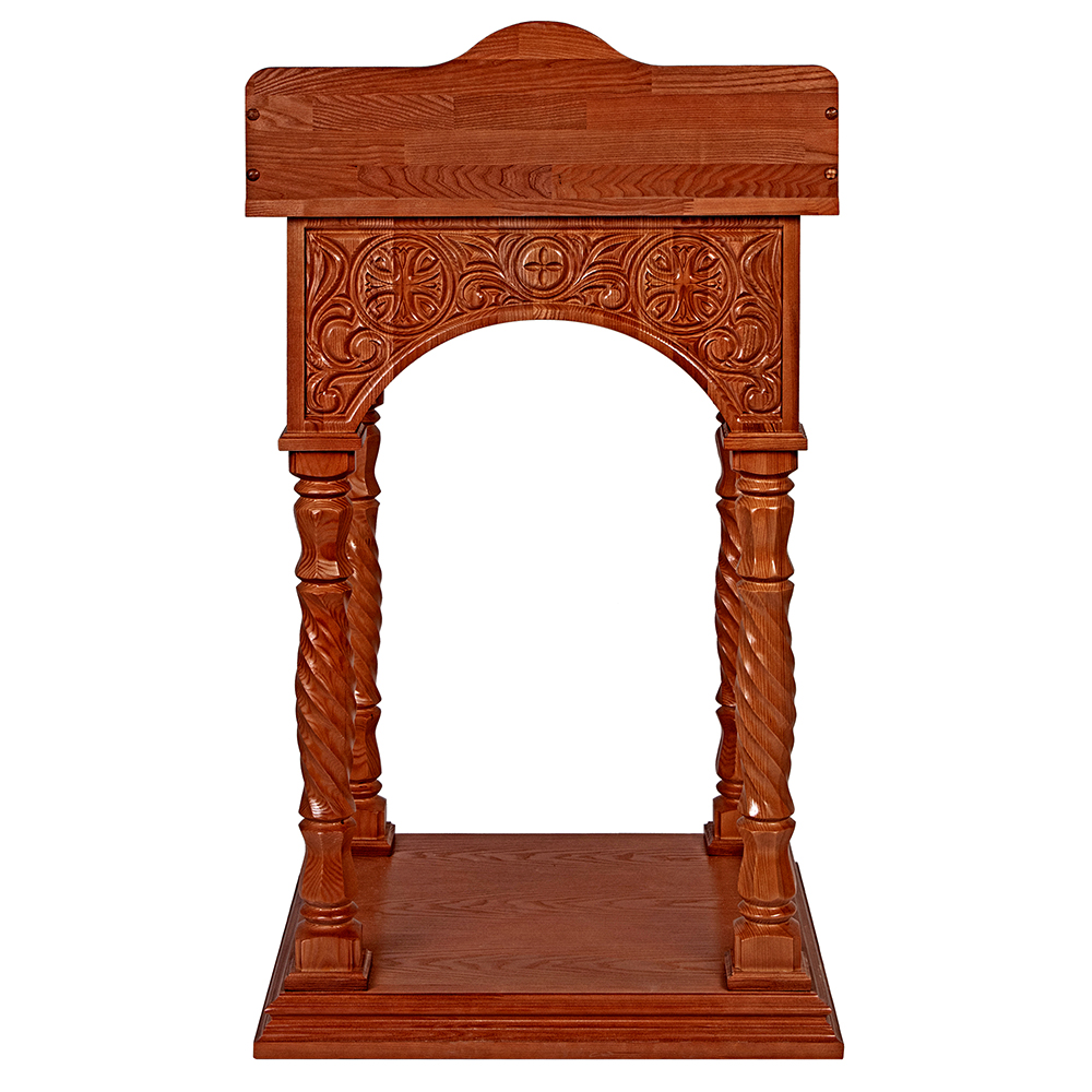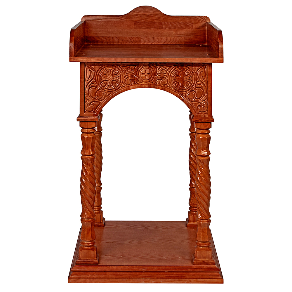 Пеленальный стол серии «Тверская» изготовлен из натуральной древесины: для крупных основных деталей использован ясень, для дополнительных – сосна. В качестве главного украшения выступает изысканная резьба, украшающая лицевую и боковые поверхности. Массивная конструкция опирается на высокие резные ножки, стоящие на сплошном основании квадратной формы. Пеленальный стол в цвете «кипарис» дополнит интерьер крестильни или основной части храма и поможет родителям быстрее подготовить малыша к Таинству Крещения.