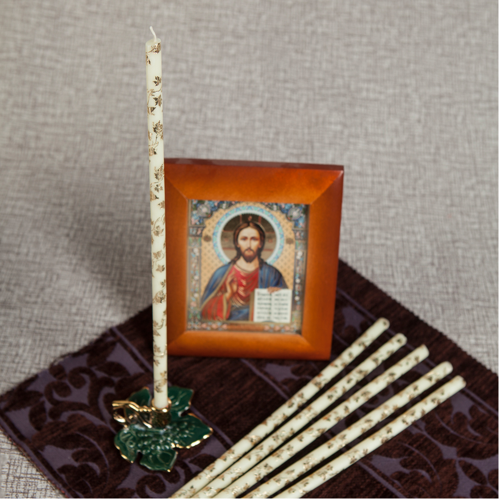 Свечи изготовлены по традиционной технологии из пищевого парафина и церезина. Они украшены золочением в виде виноградной лозы, оплетающей свечу. Само покрытие имеет толщину в несколько микрон, отчего полностью сгорает, не оставляя после себя твердых веществ.