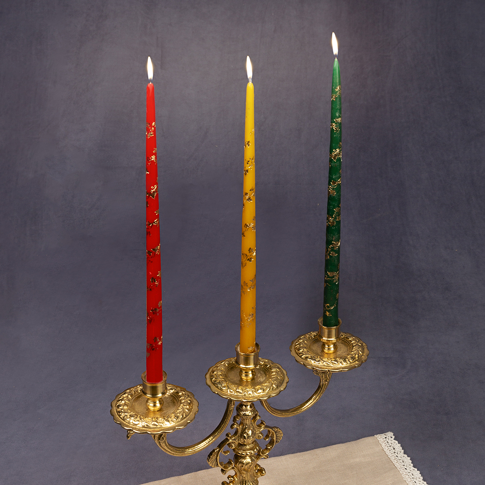 Свечи изготовлены по традиционной технологии из пищевого парафина и церезина. Они украшены золочением в виде виноградной лозы, оплетающей свечу. Само покрытие имеет толщину в несколько микрон, отчего полностью сгорает, не оставляя после себя твердых веществ.