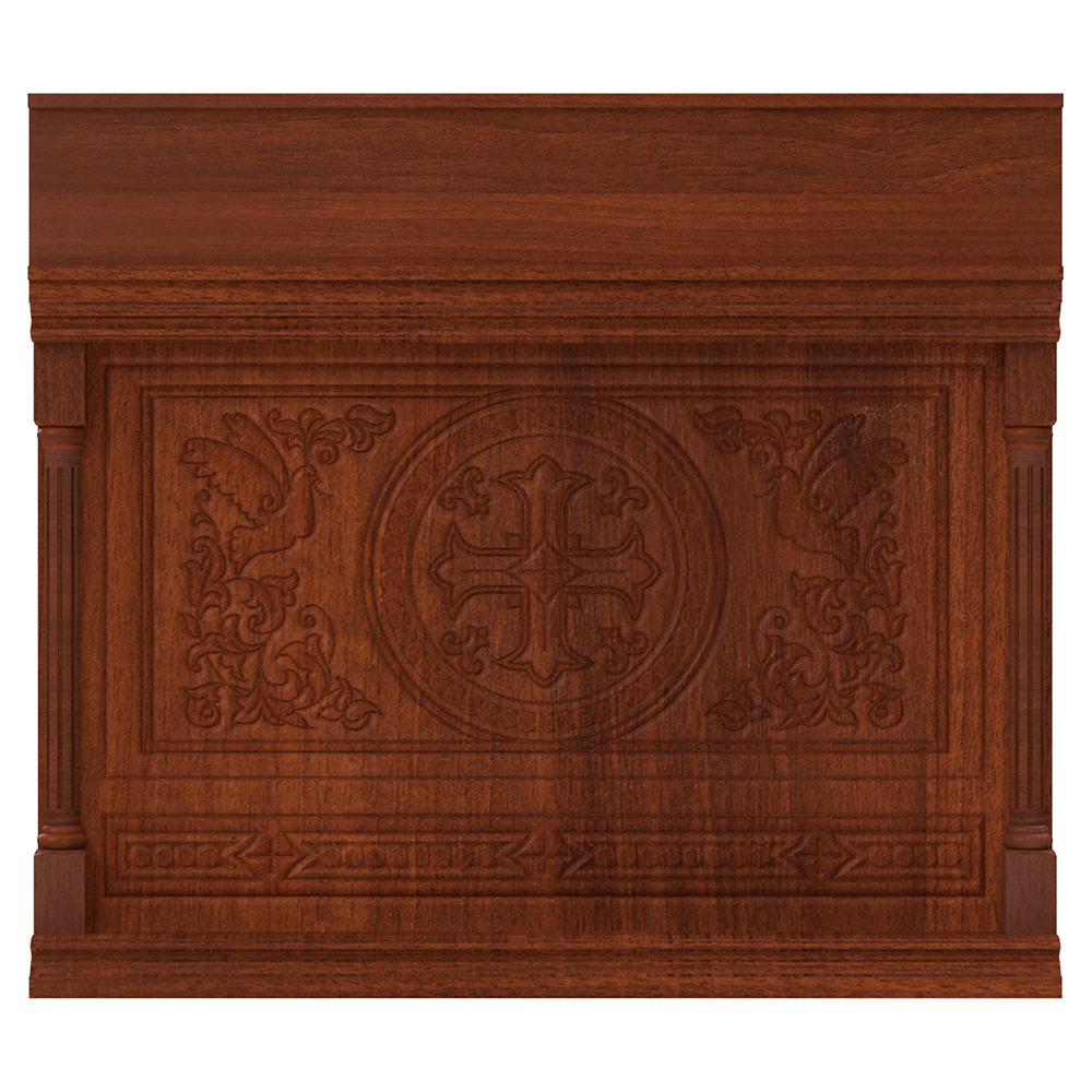 Рабочая зона продавца (секция №17) из ЛДСП и натуральной древесины с декоративной резьбой для свечной лавки серии «Судиславская».