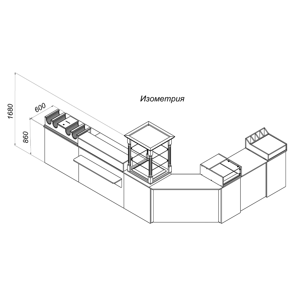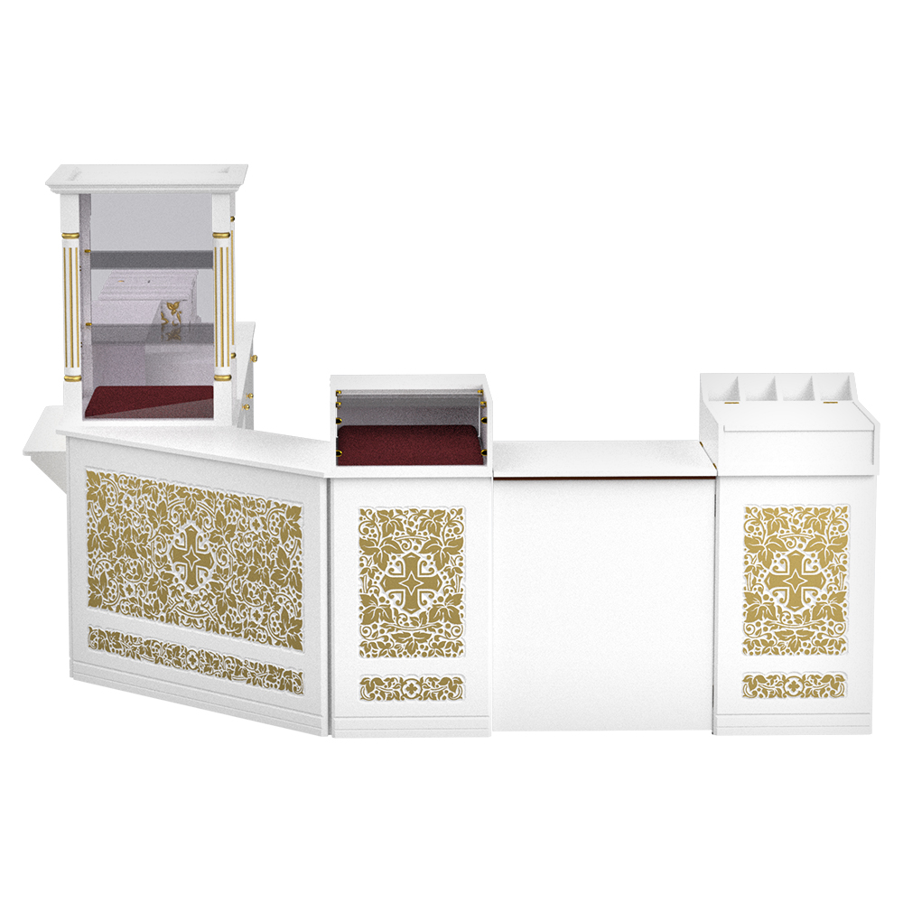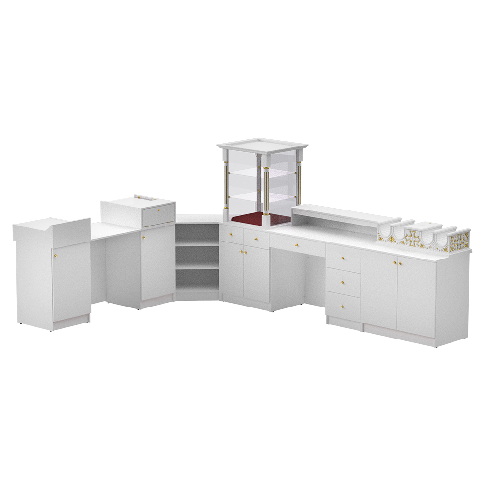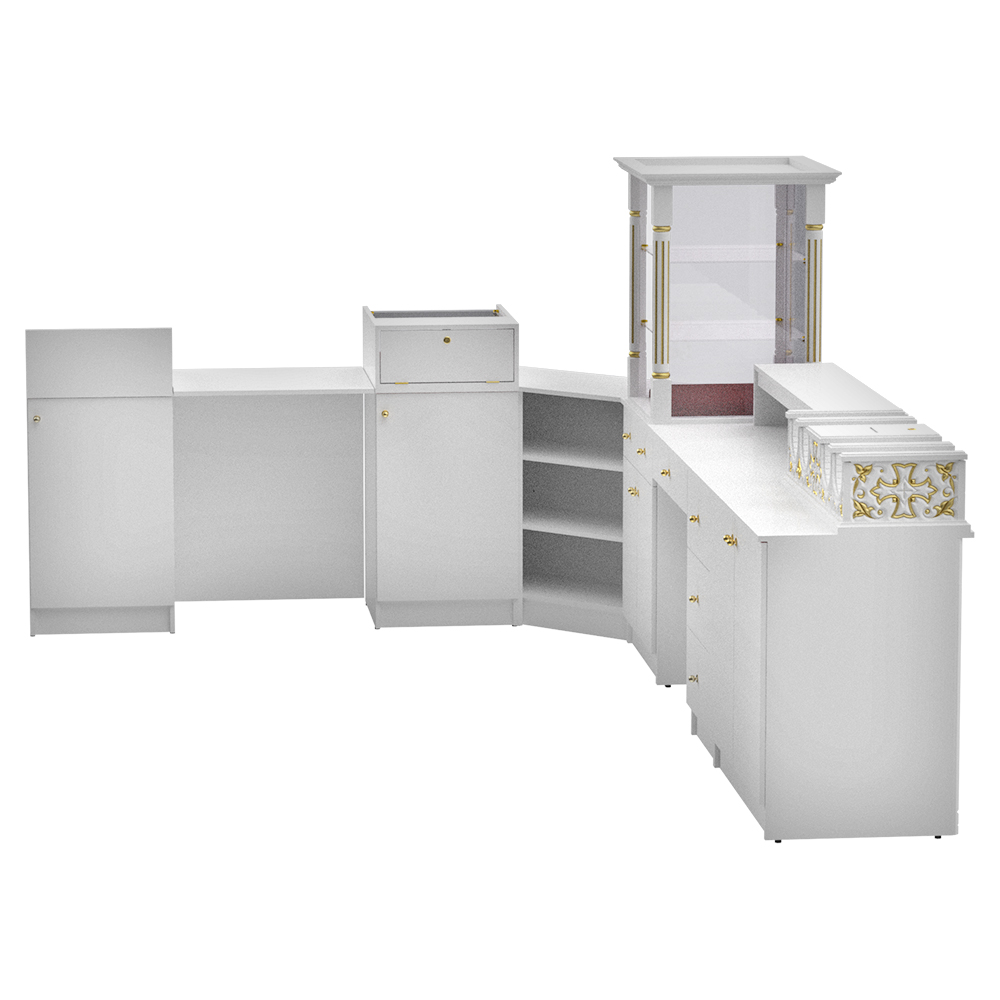 Свечная лавка серии «Суздальская» с настольной витриной, угловым модулем, свечным ящиком, ящиком для записок в варианте компоновки №5.