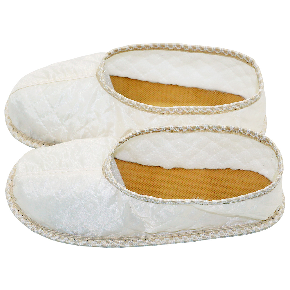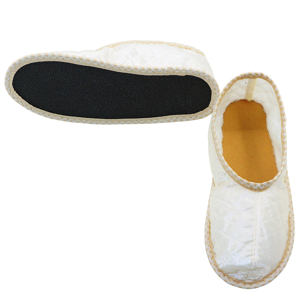 Погребальные тапочки сшиты из легкой подкладочной ткани. Внутрь уложена стелька из спанбонда, подошва выкроена из прочной кирзы. В продаже представлены изделия белого и черного цветов разных размеров на выбор покупателя.